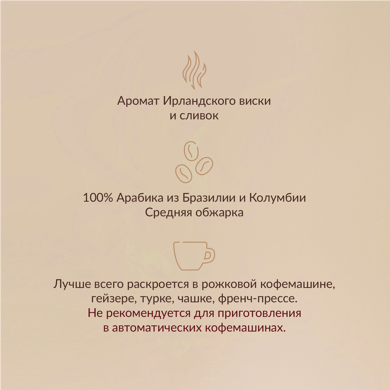 Идеальное сочетание насыщенного кофе, ирландского виски и сливок создает неповторимый глубокий вкус, в котором горчинка смягчается кремовым послевкусием.