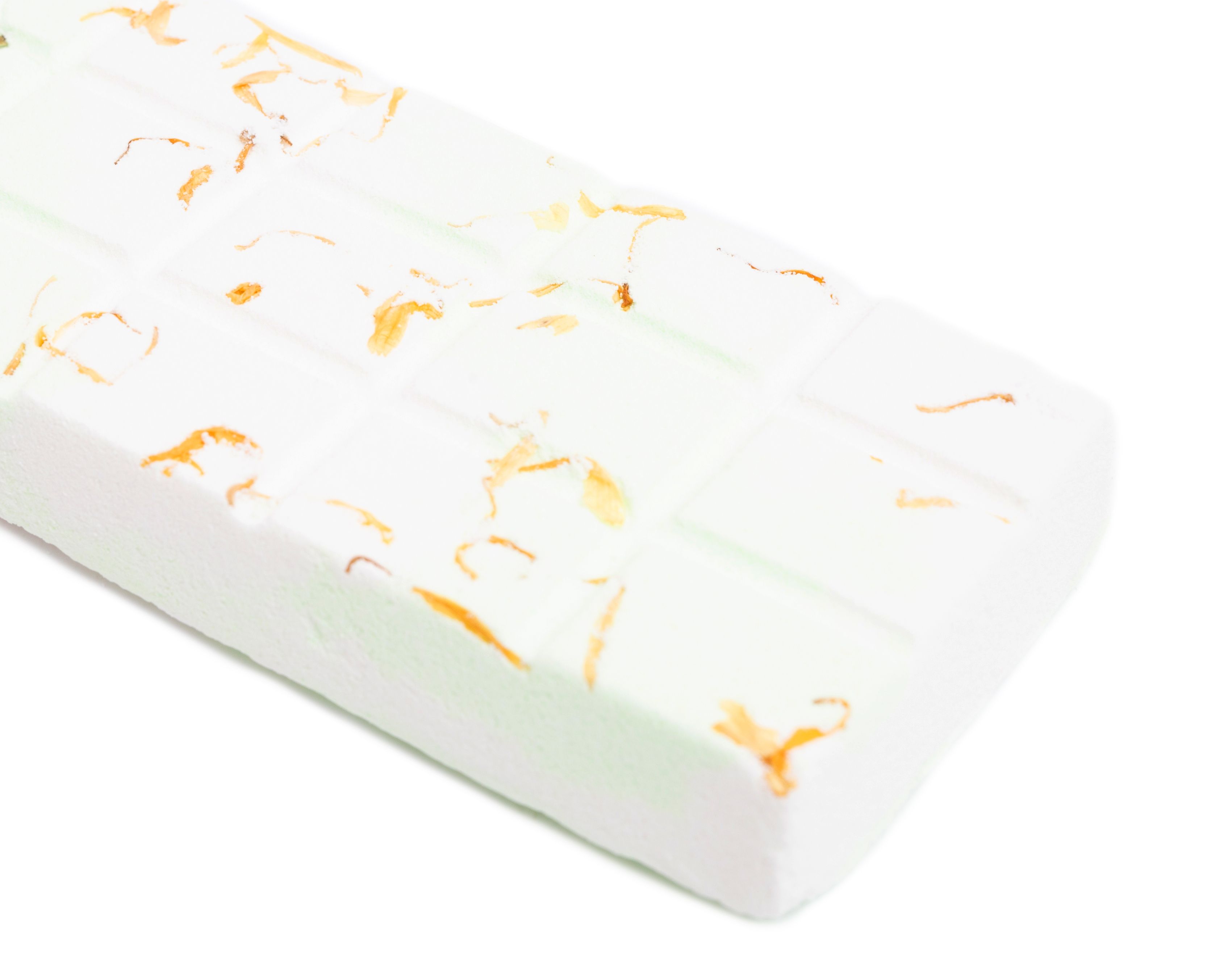 Бомбочку украшают нежные лепестки календулы, которые при погружении в воду становятся словно живыми, украшая собой воду и добавляя ванным процедурам изящности.