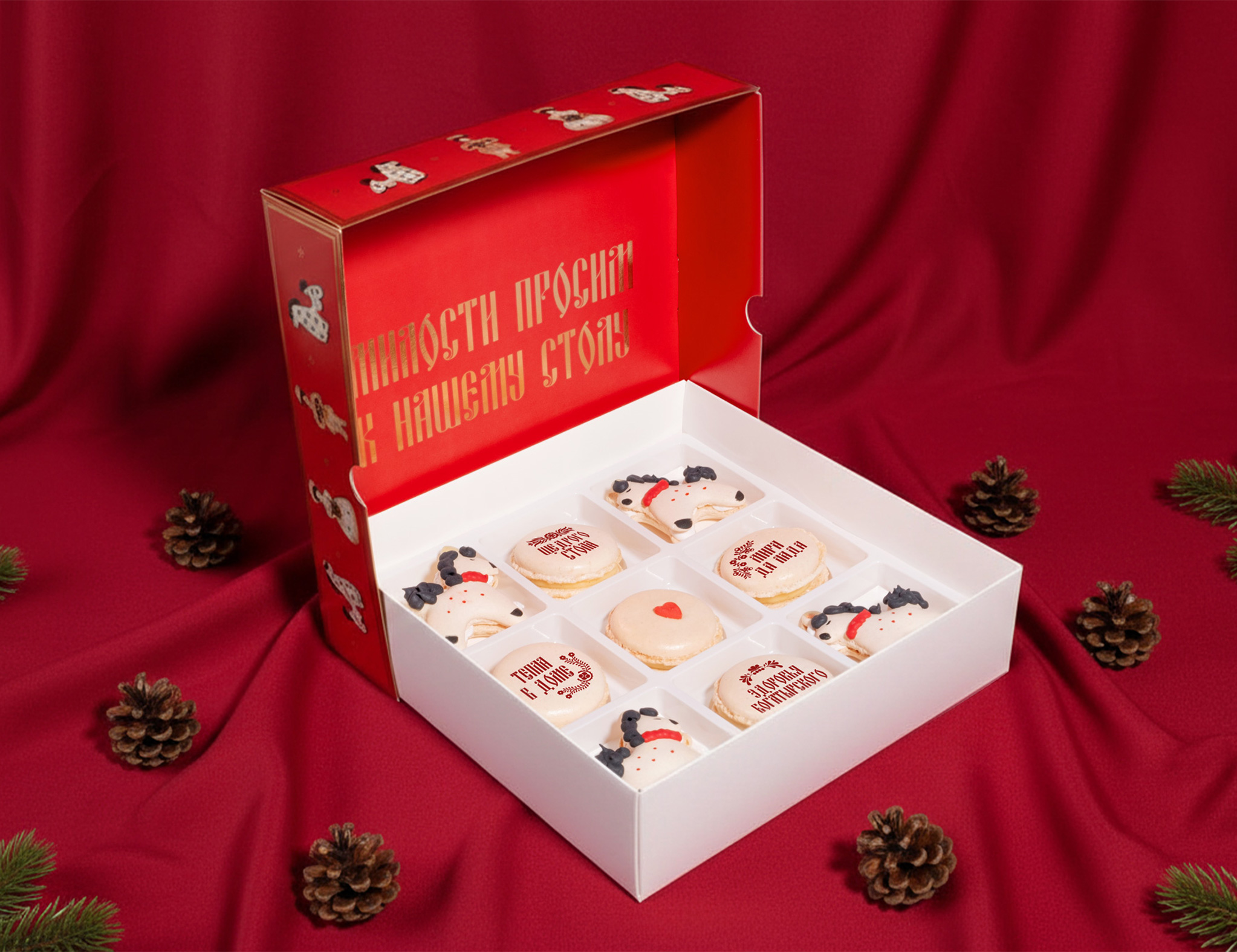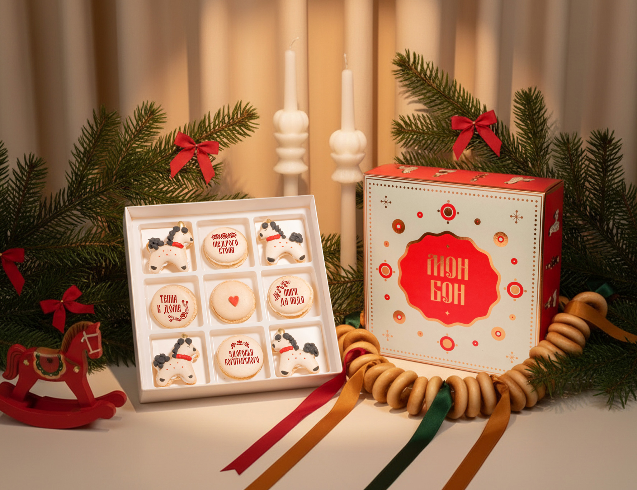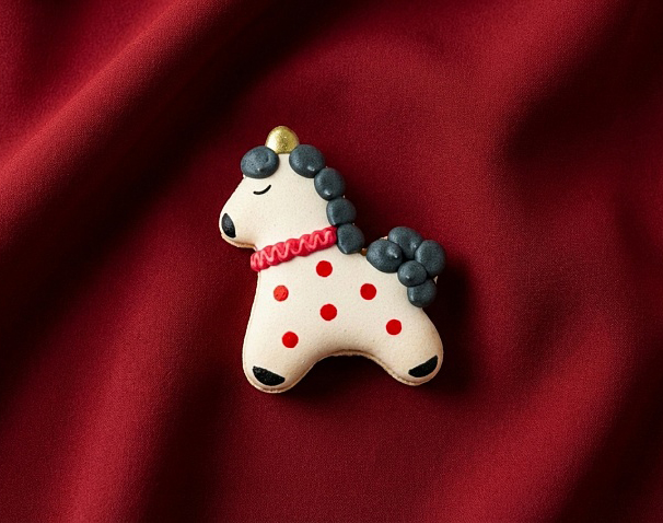 Внутри девять макаронов, которые будто сошли с новогоднего стола: четыре нарядных коня в духе дымковской игрушки и четыре пирожных с добрыми пожеланиями. А в центре макарон с сердцем, потому что всё начинается с любви.