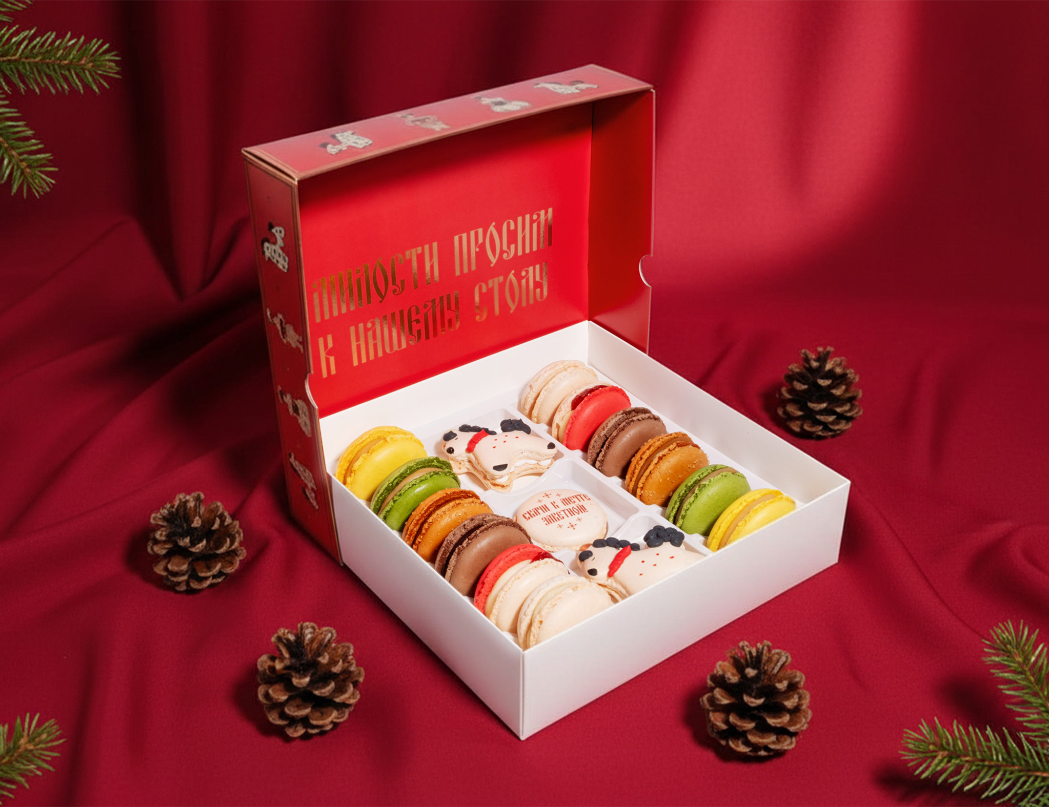 В этом ярком наборе 15 пирожных макаронов, среди которых две фигурные дымковские лошадки, будто с карусели детства. Остальные классические вкусы в праздничной палитре, которые радуют не только вкусом, но и видом.