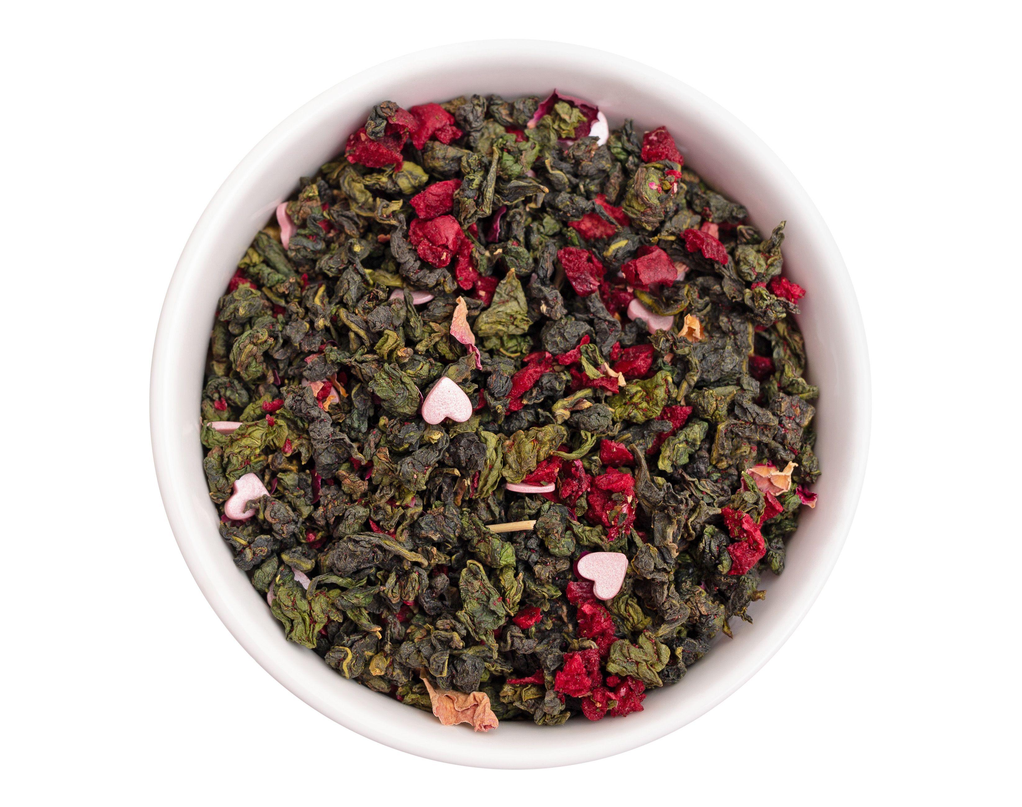 Улун с нежным цветочным ароматом сакуры, лепестками розы, кусочками вишни и очаровательными сахарными сердечками.
