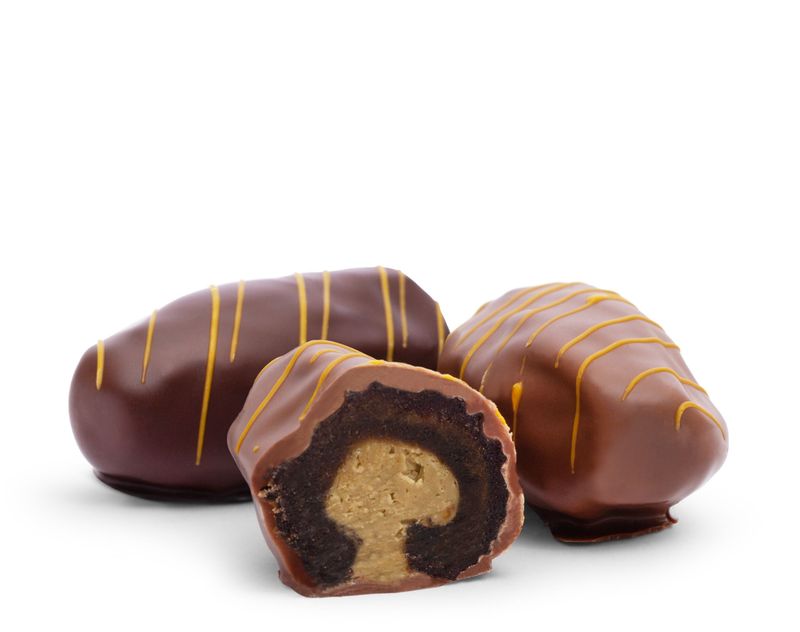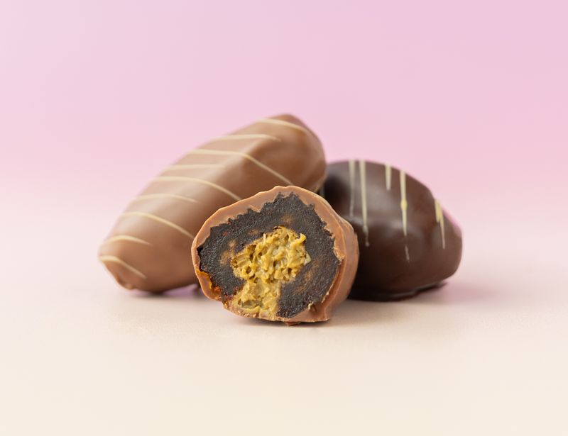 Темный шоколад собственного производства, обладающий насыщенным вкусом и глубоким ароматом какао, идеально подчеркивает натуральную сладость фиников, создавая гармоничное сочетание. Молочный шоколад, в свою очередь, добавляет нежности и сливочности десерту, раскрывая фисташковое звучание в начинке.