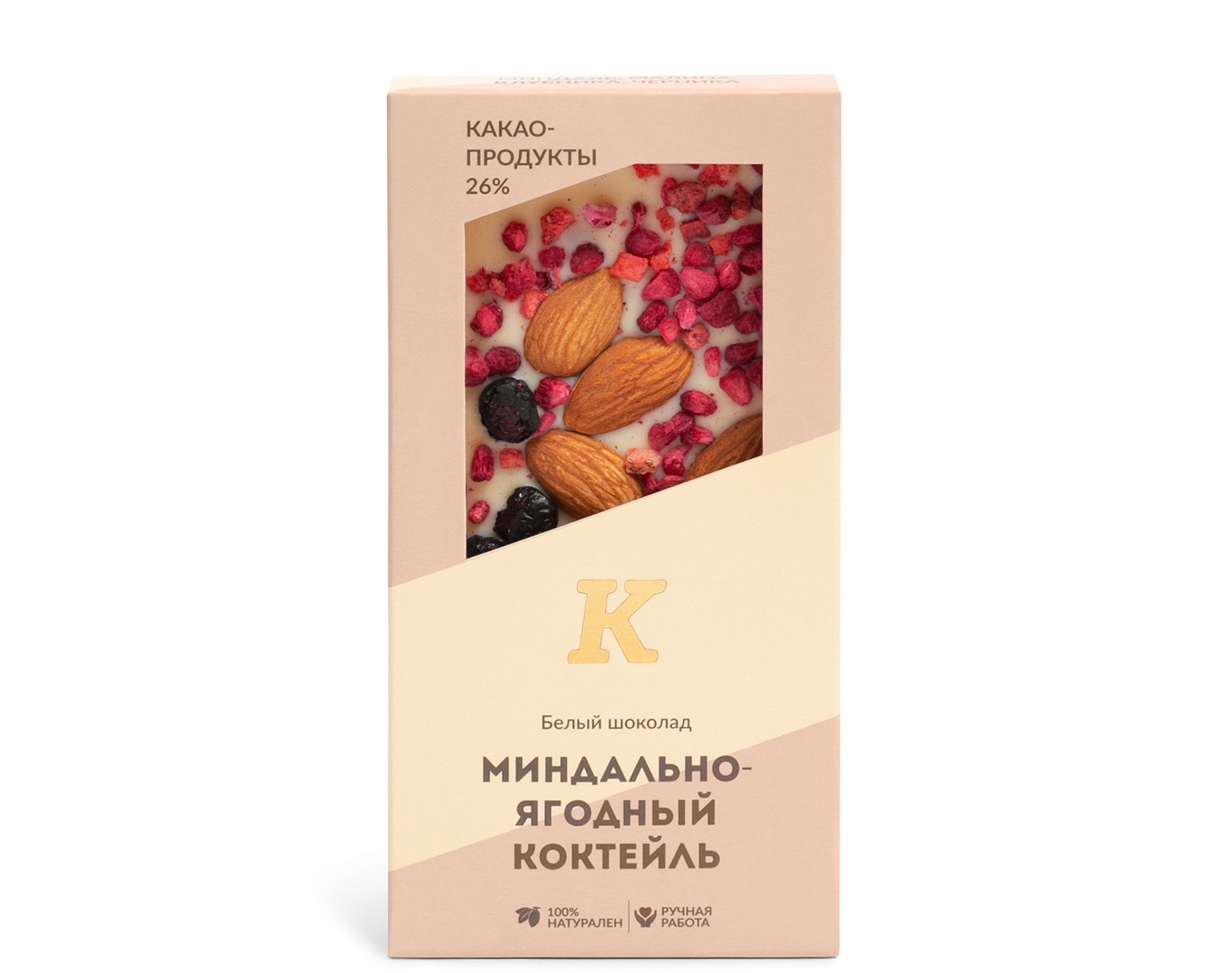 Обволакивающий белый шоколад с оттенками топленых сливок дополнен отборным миндалем, сублимированной клубникой, малиной и черникой.