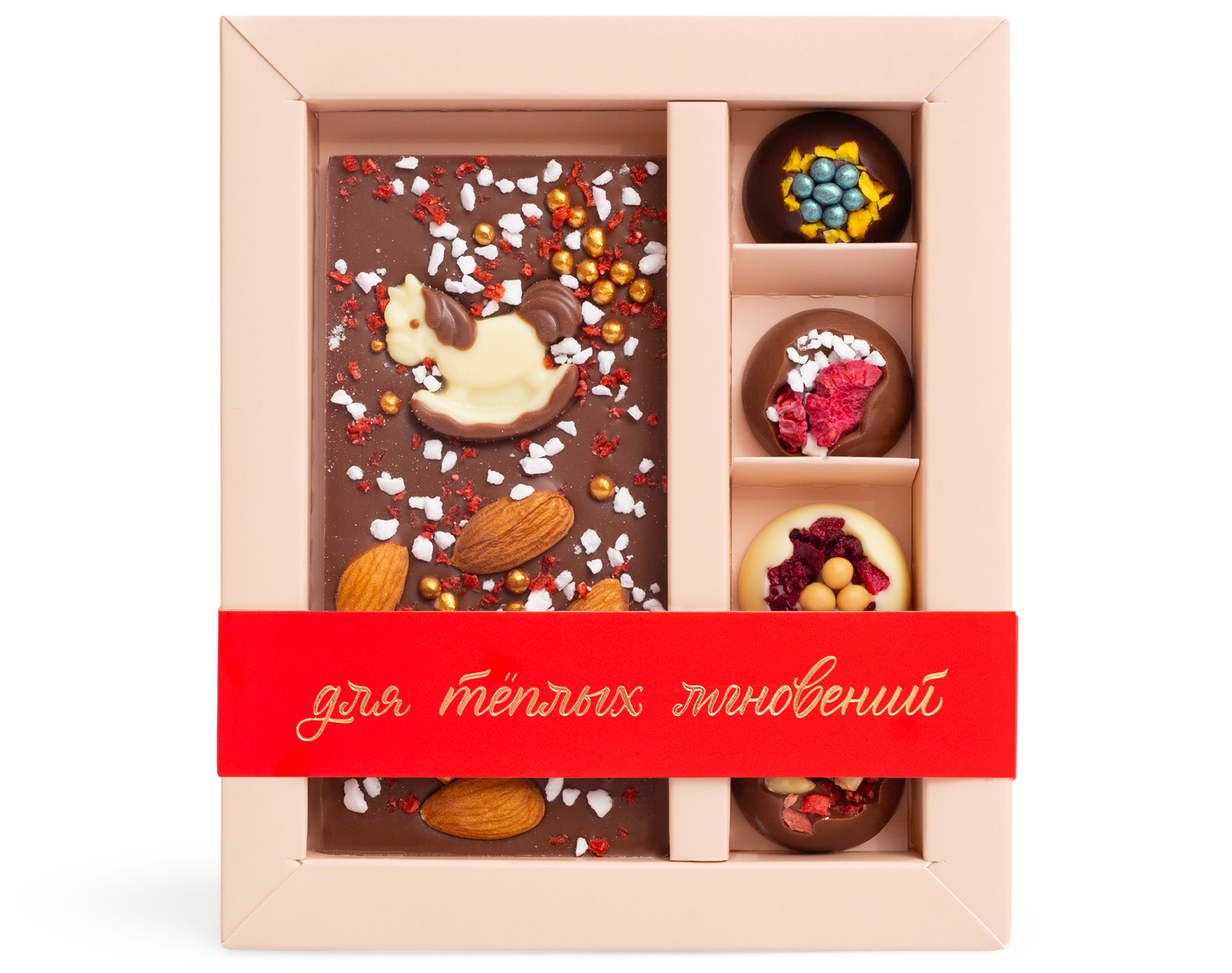 Название набора точно передает атмосферу зимних праздников — времени уюта, радости и сладких мгновений рядом с близкими. Основа плитки приготовлена из нежного молочного шоколада. Центральный акцент — фигурка лошадки из белого и молочного шоколада, выполненная вручную кондитерами. Вкус и настроение дополняет посыпка из цельного миндаля, кранча клубники, меренги и хрустящих шариков криспи.