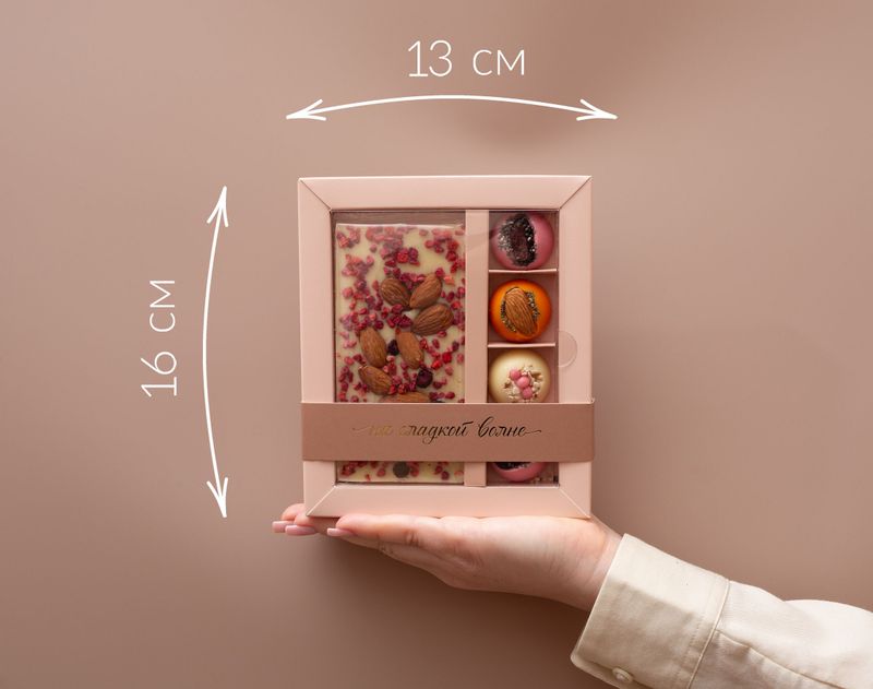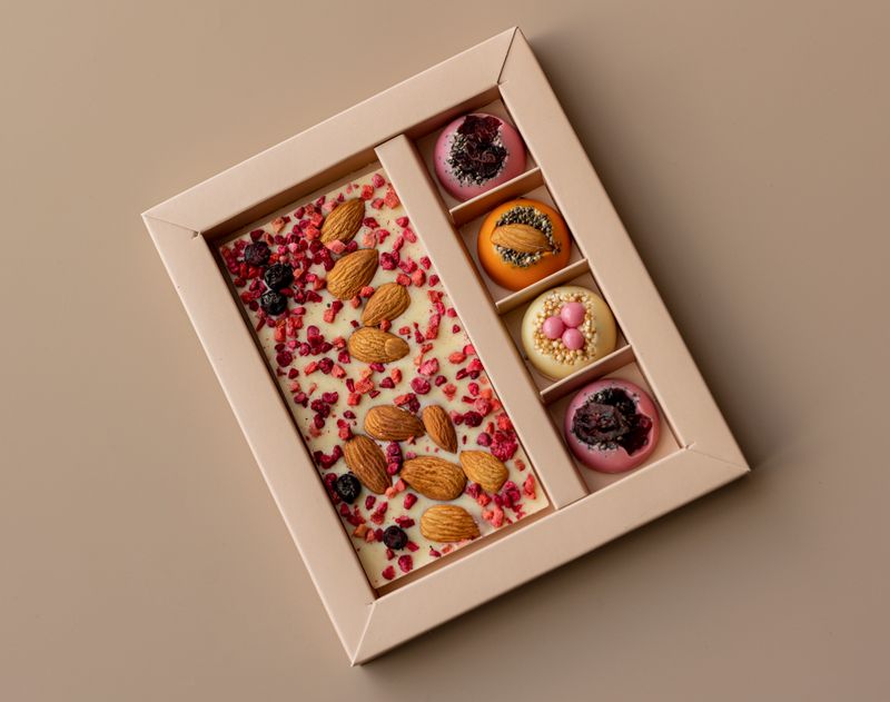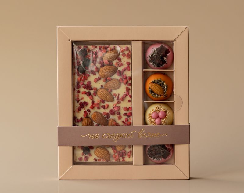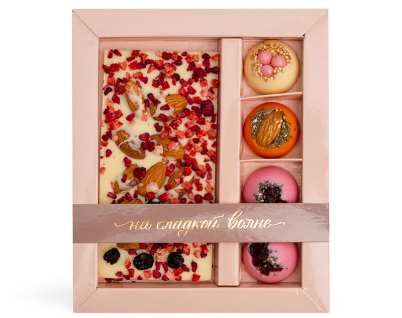 В наборе вы найдете шоколадную плитку «Миндально-ягодный коктейль» из белого шоколада с добавление миндаля и ягод, а также четыре уникальных по вкусу шоколадные «полусферы»: