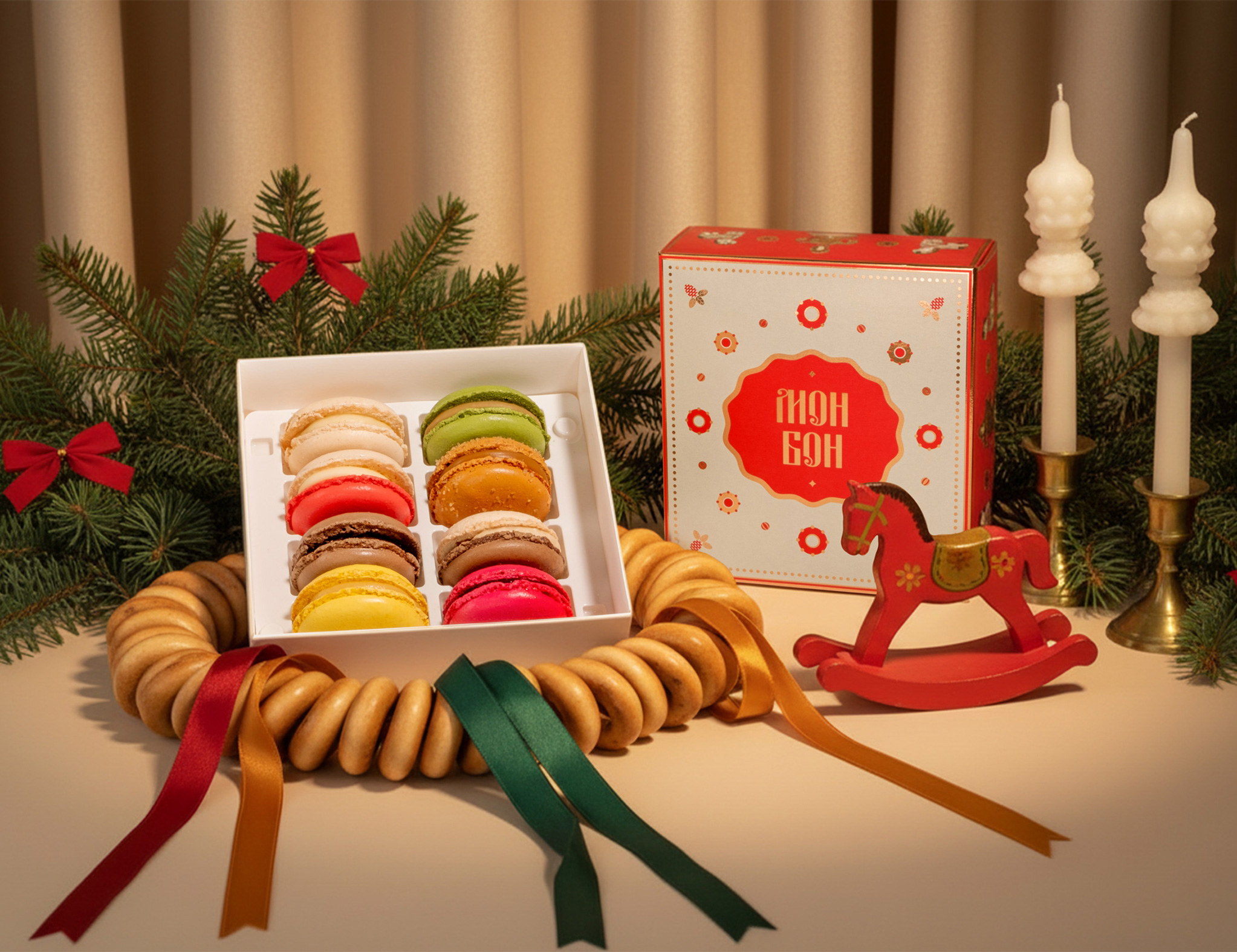Внутри 8 пирожных макаронов из классической линейки Mon Bon: любимые вкусы, новогодние цвета и безупречная текстура. Это ассорти словно собрано из разных глав зимней сказки, для тех, кто любит удивляться и угощать.