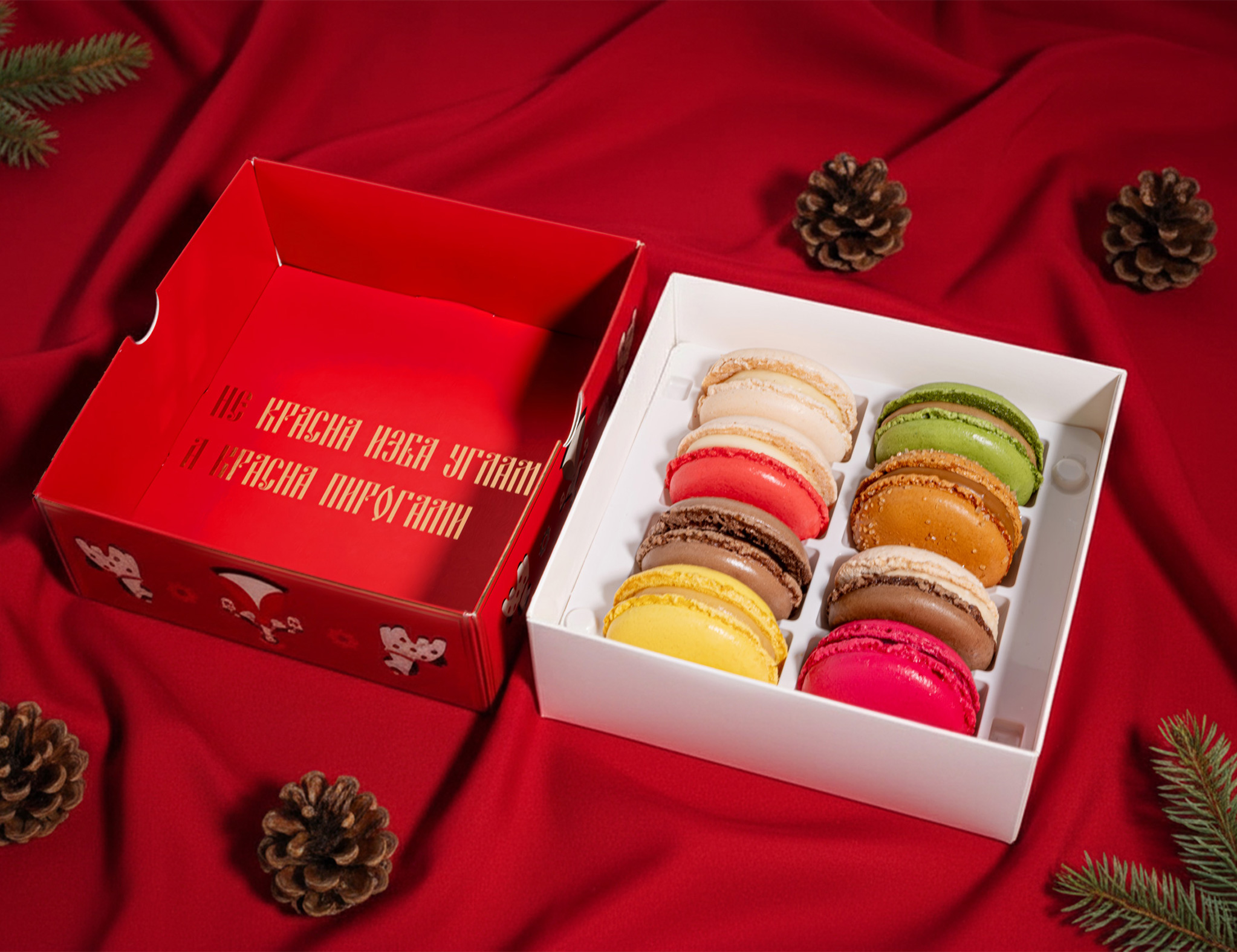 Коробка оформлена в новогодней палитре с элементами дымковской росписи и золотыми акцентами. А внутри — послание: «Не красна изба углами, а красна пирогами».