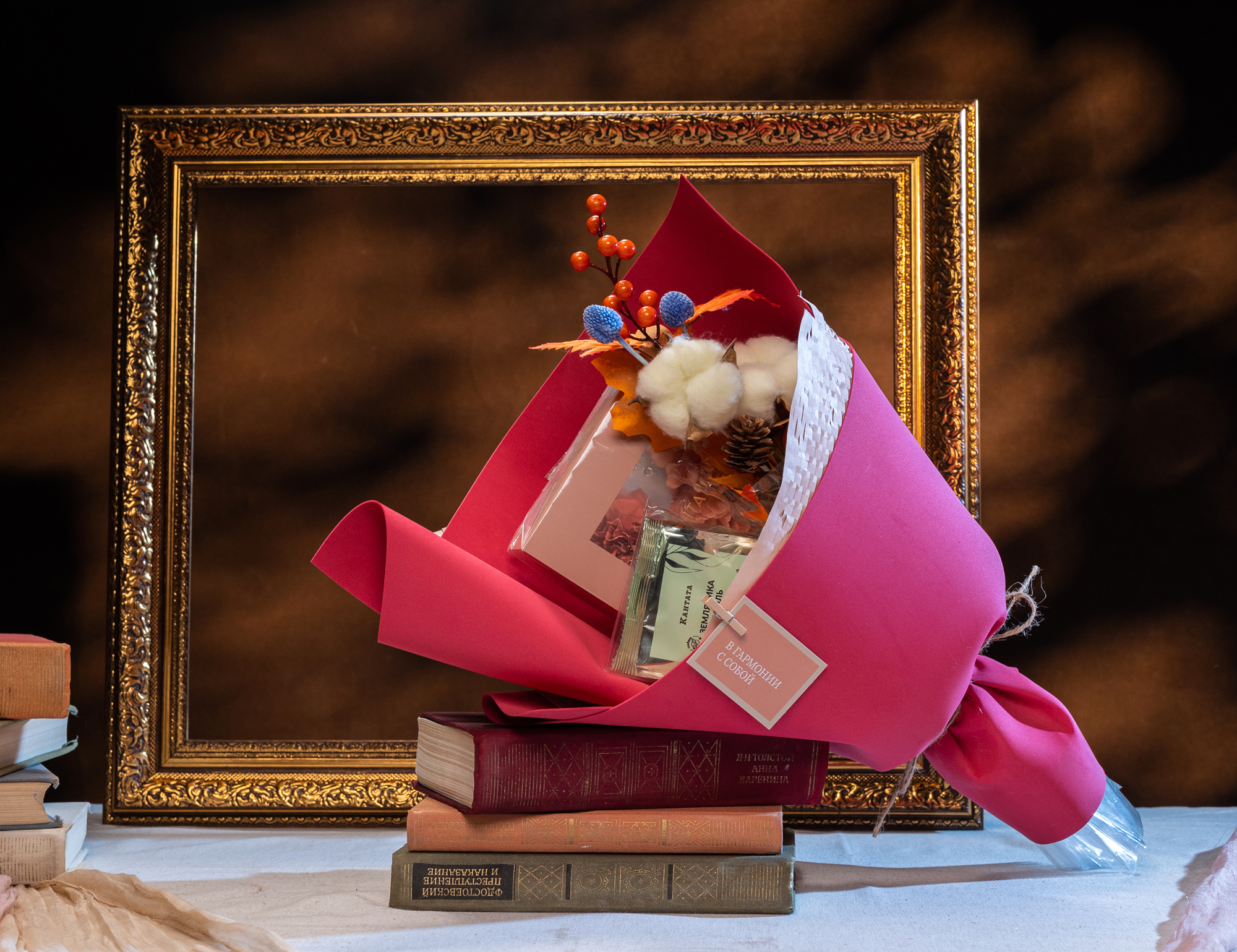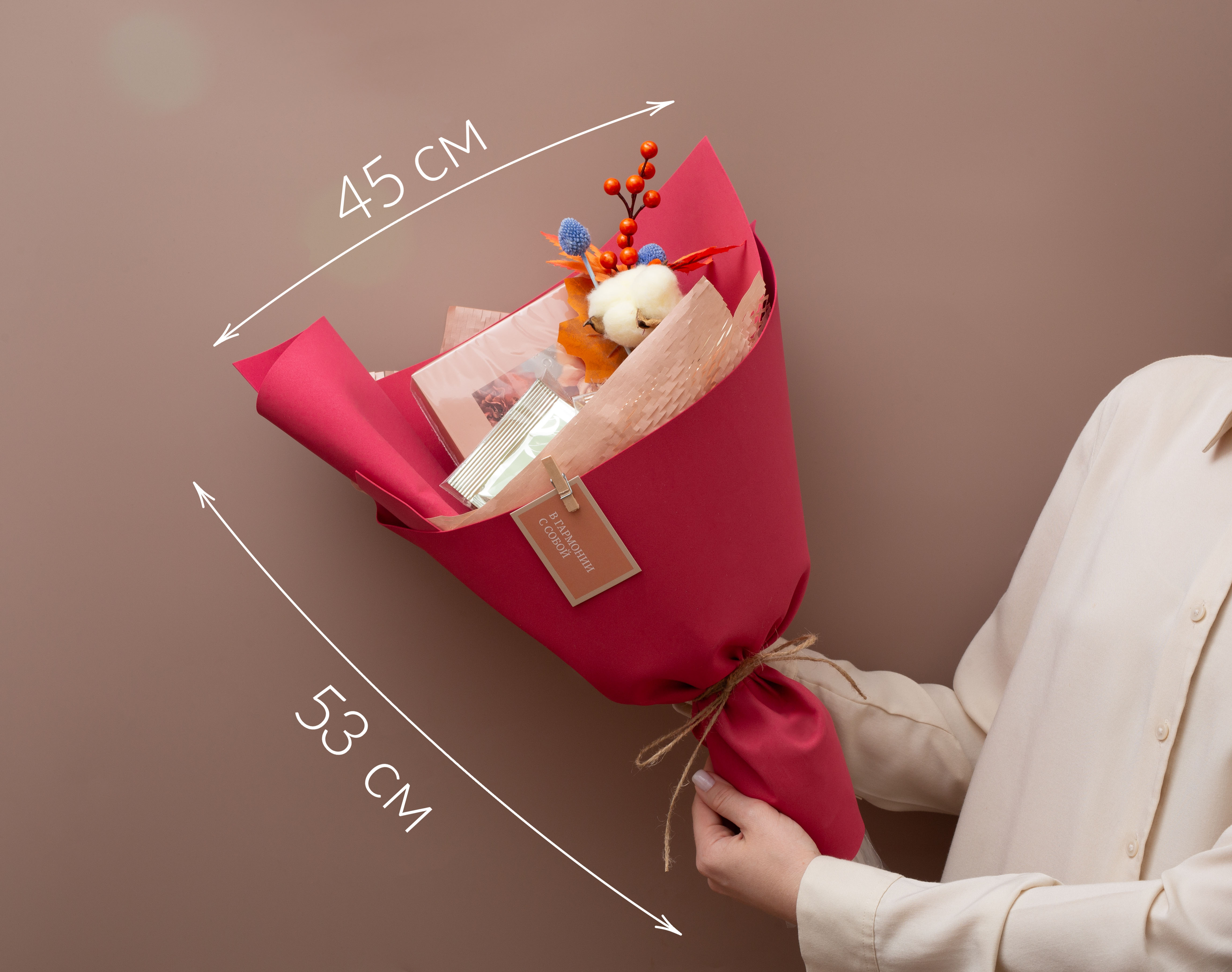 Этот яркий букет собран из тёплых красок осени — яркой упаковки, осенней вставки и коллекции вкусов. А внутри — кофе с ароматом банана, зелёный чай, черный чай - восхитительные ароматы и невероятная польза. Красивый, бодрящий и запоминающийся подарок. Настоящий бум вкусов и эмоций.