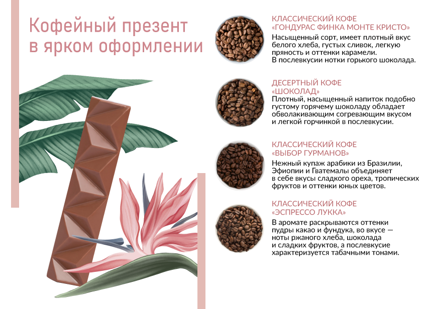 Долгожданный подарок для того, кто ценит вкусный кофе! В букете собрана коллекция из четырех сортов, дополненных десертом ручной работы.