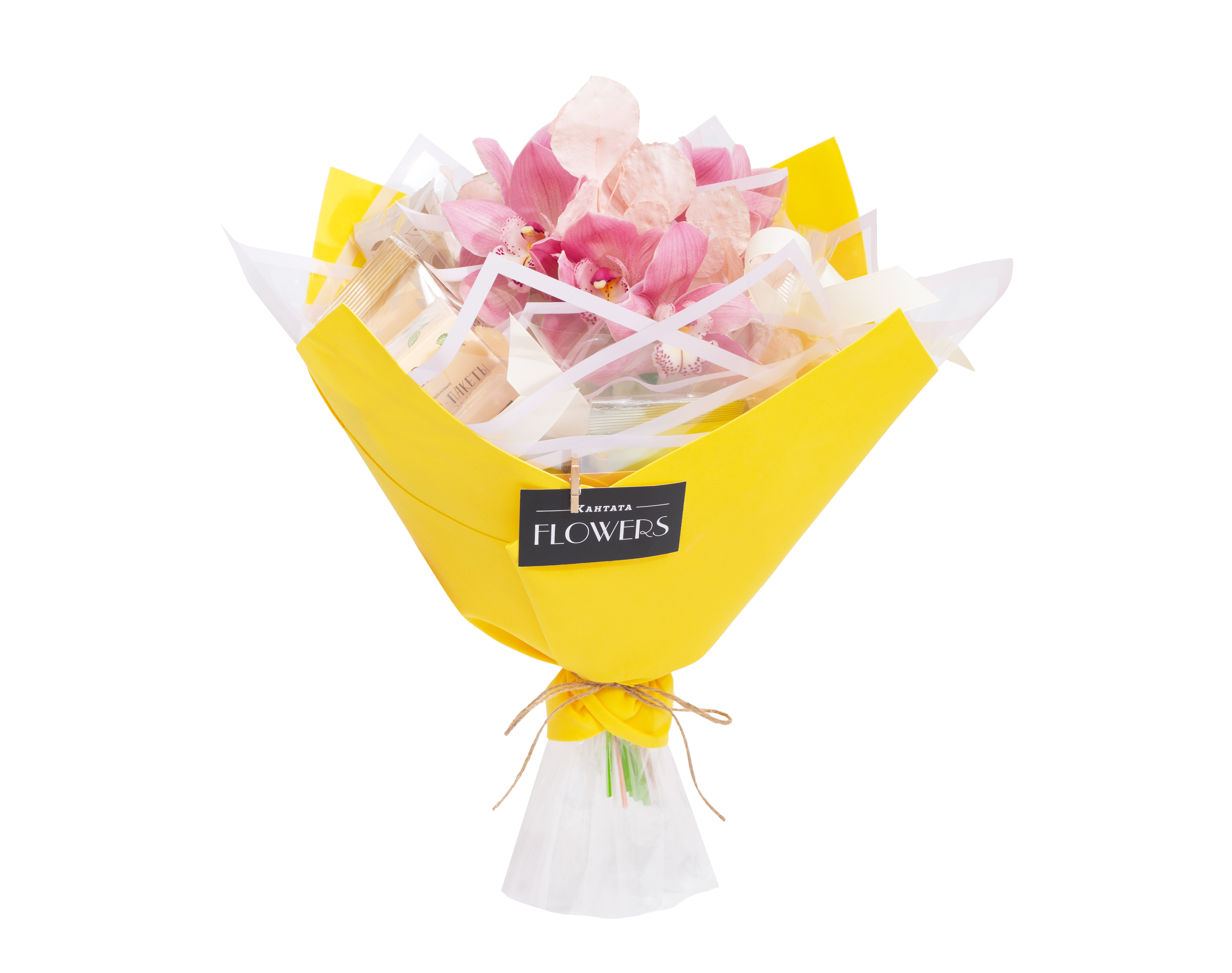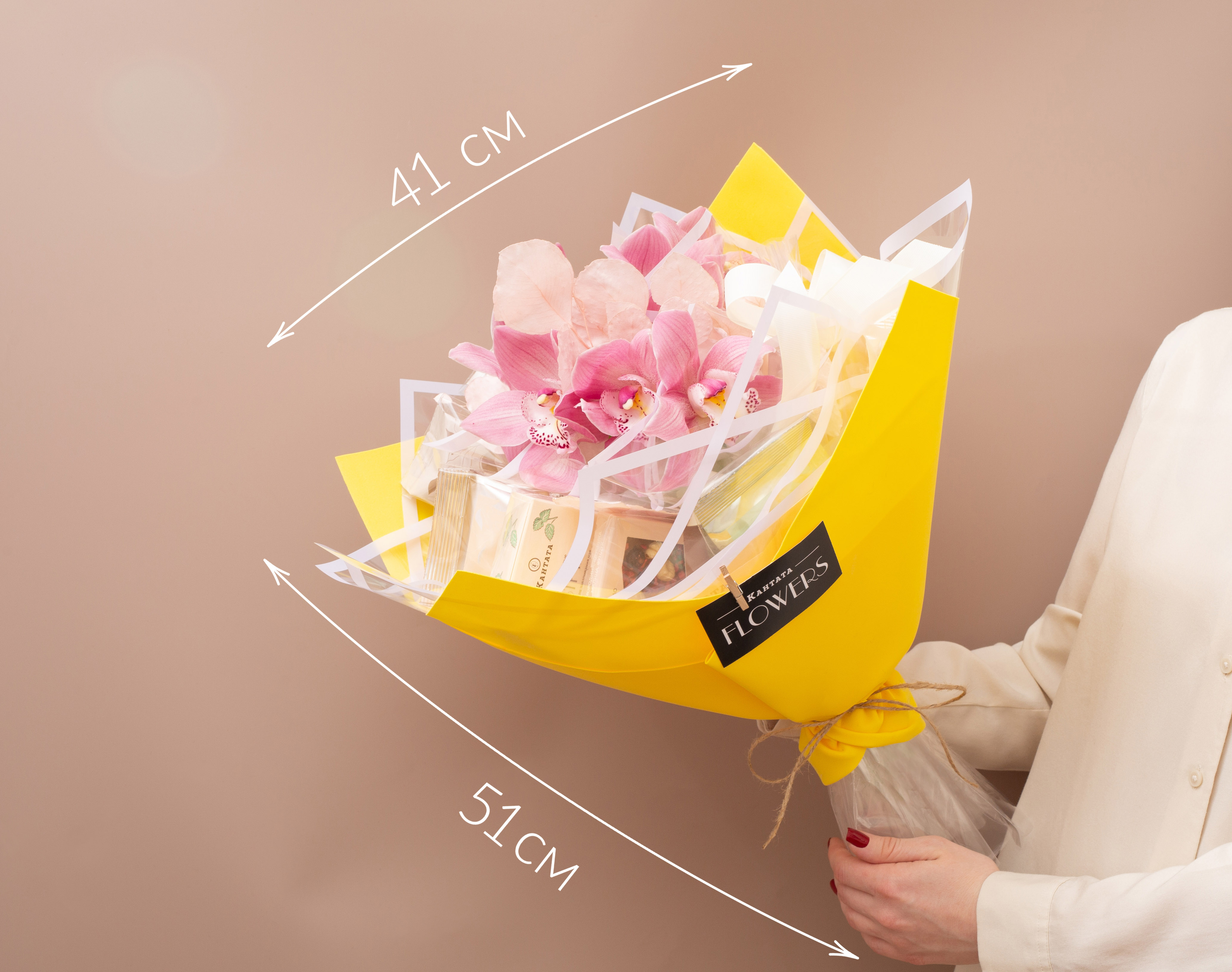 Пусть улыбки сияют ярче солнца! В этом букете сочлись нежные живые цветы, четыре душистых чая и два сорта кофе в зернах. К согревающим напиткам — шоколад ручной работы двух видов и аксессуары для заваривания.