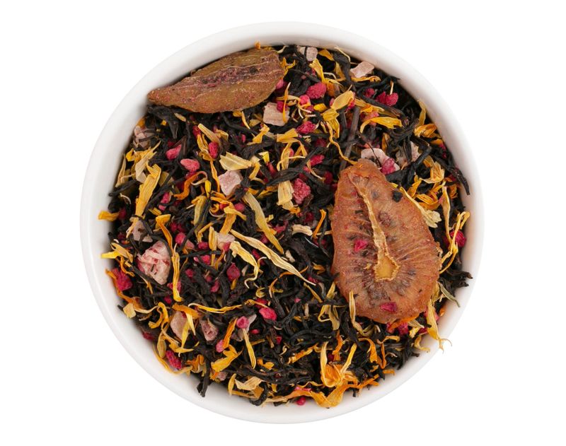 Состав: черный чай, цукаты ананаса, киви, лимон, ягоды малины, лепестки календулы, ароматизатор.