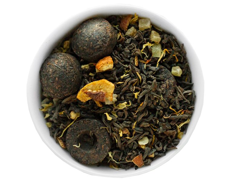 Состав: чай пуэр, апельсиновые корочки, черный чай байховый, цукаты ананаса (ананас, сахар), натуральный ароматизатор, цветы сафлора и календулы.