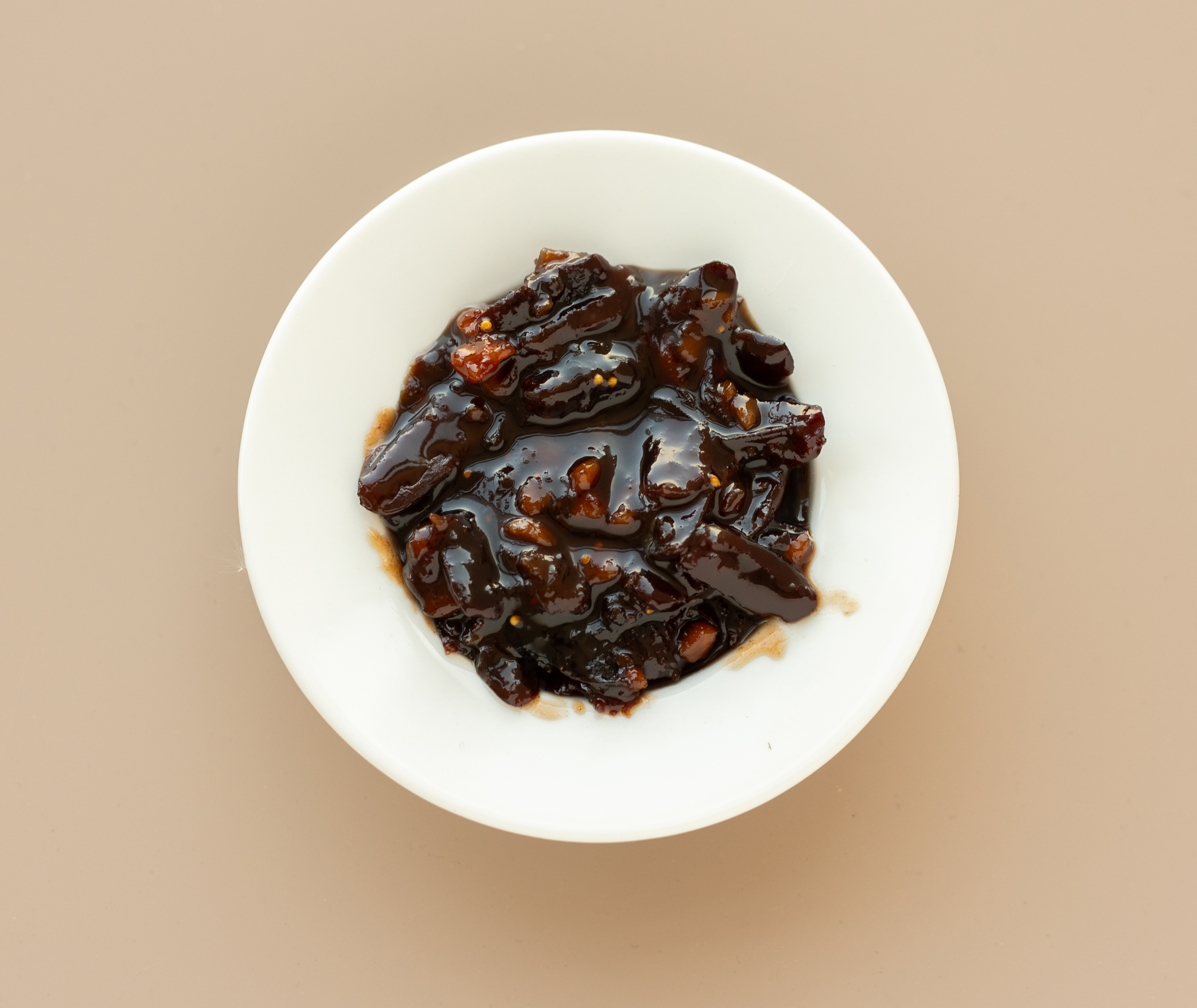 Состав: оливки «Каламата» (33,6%), глюкоза, сахар, сушеные белый инжир (3,7%), жареный миндаль (2,5%), бальзамический уксус (содержит сульфиты), регулятор кислотности: лимонная кислота, морская соль. Этот продукт содержит: сульфиты, древесные орехи.
