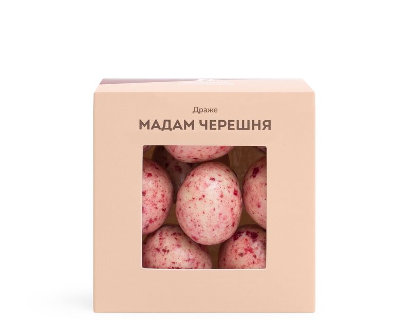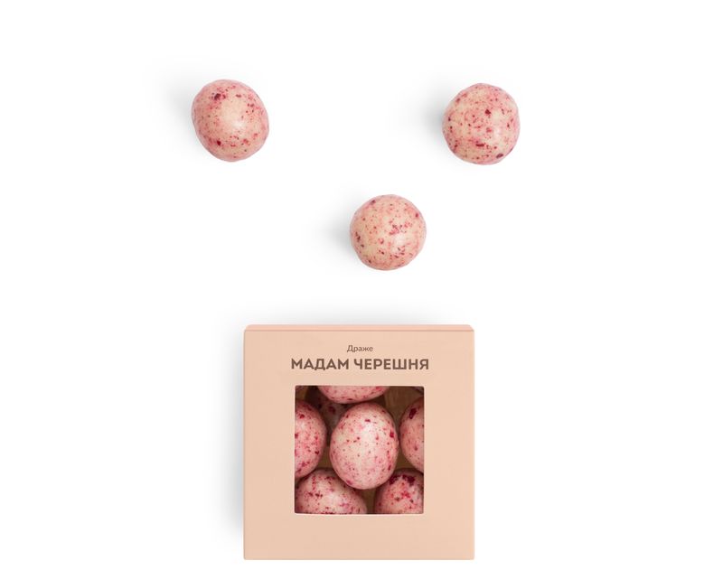 Драже «Мадам Черешня» состоит из черешни и нескольких слоёв нежного молочного и белого шоколада.