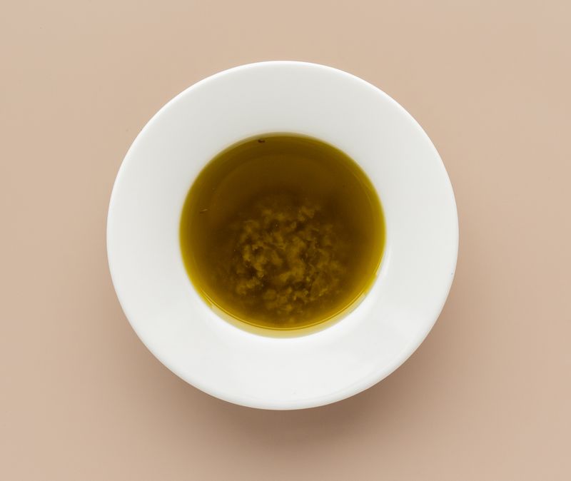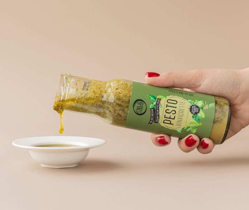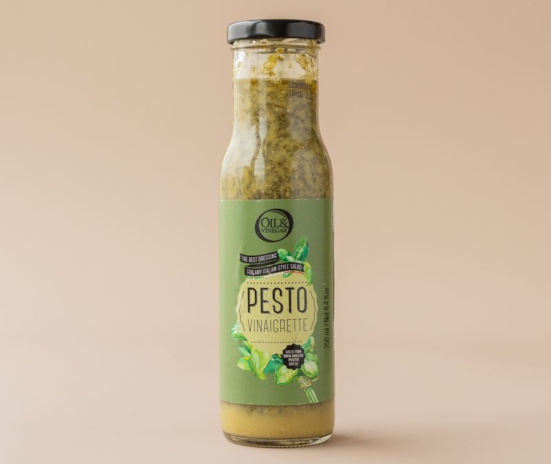 Просто хорошо встряхните бутылку - приправа для салатов, рыбы и овощей готова. Это настоящее трио: масло, уксус и песто в одном флаконе. Превосходно подойдёт для заправки кускуса, булгура или киноа.