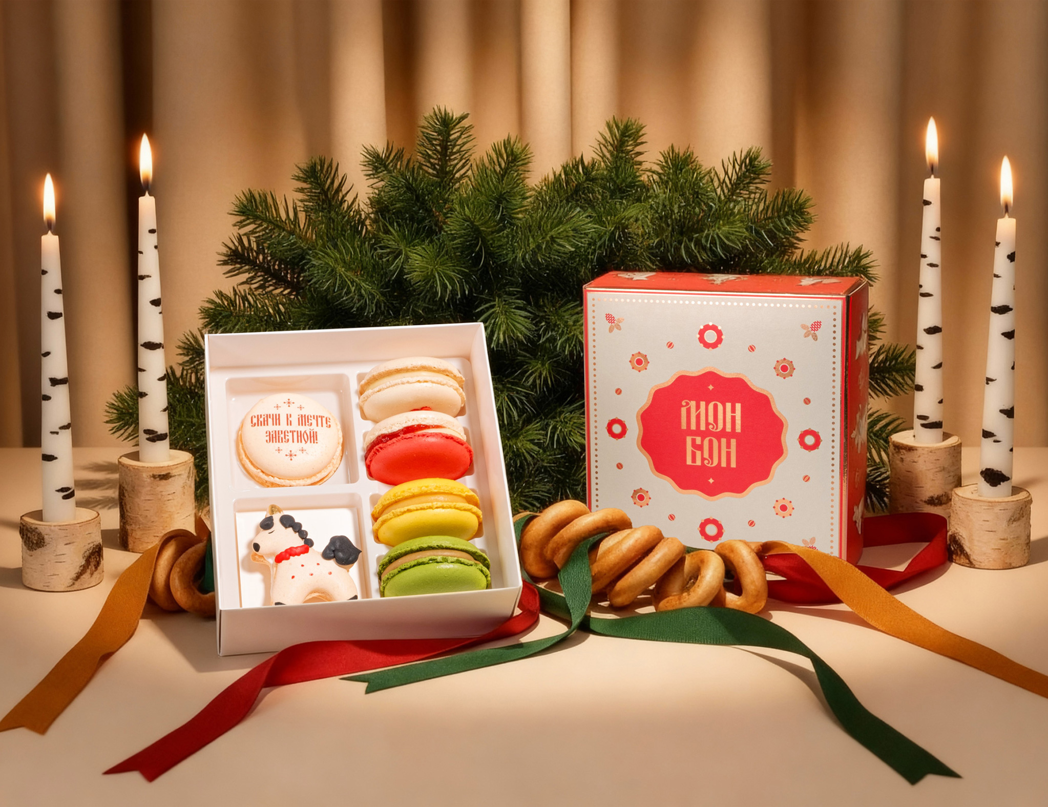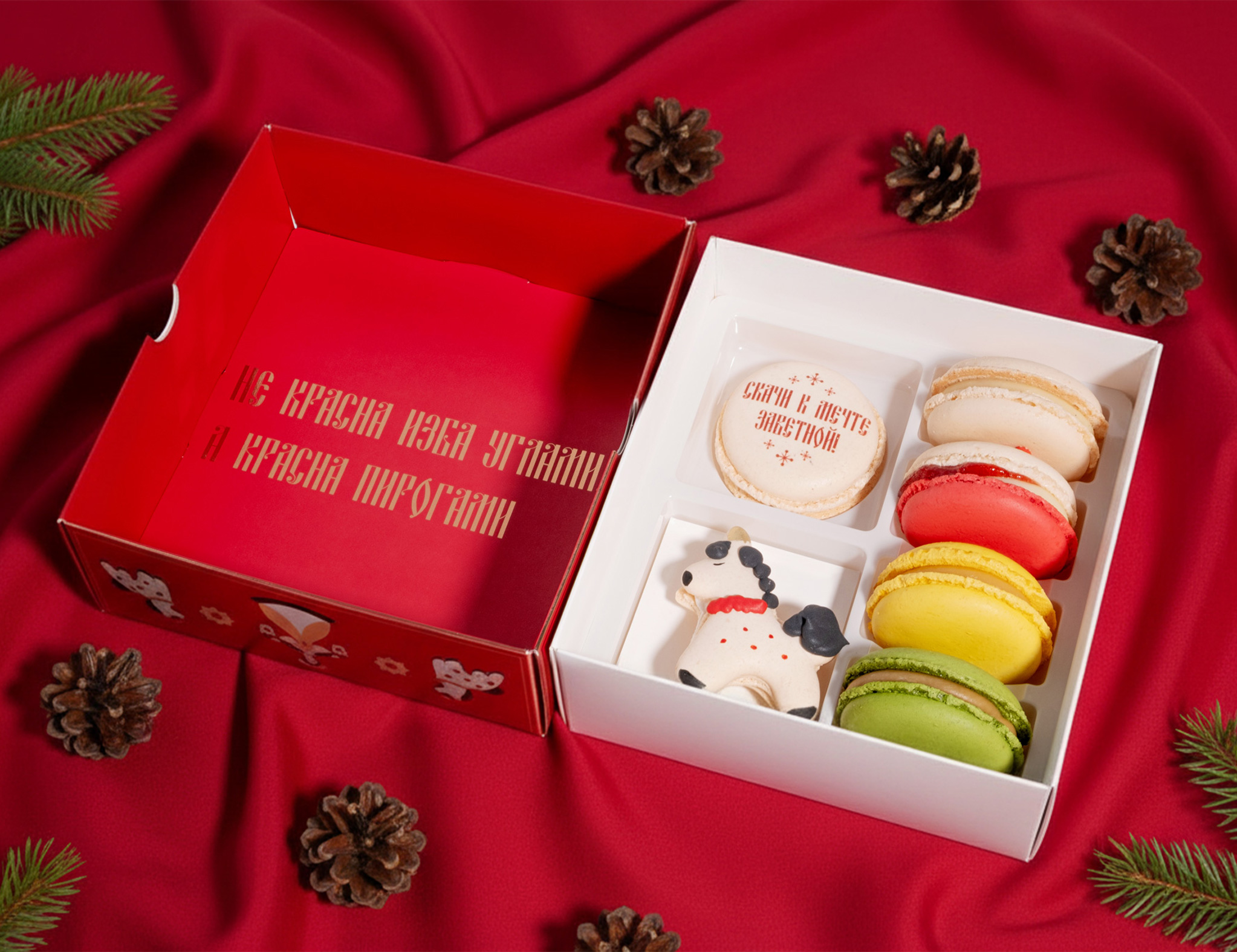 Шесть ярких пирожных, включая эффектный макарон с надписью «Скачи к мечте заветной» и фигурный макарон в форме дымковской лошади — символа радости, удачи и детской веры в чудо.