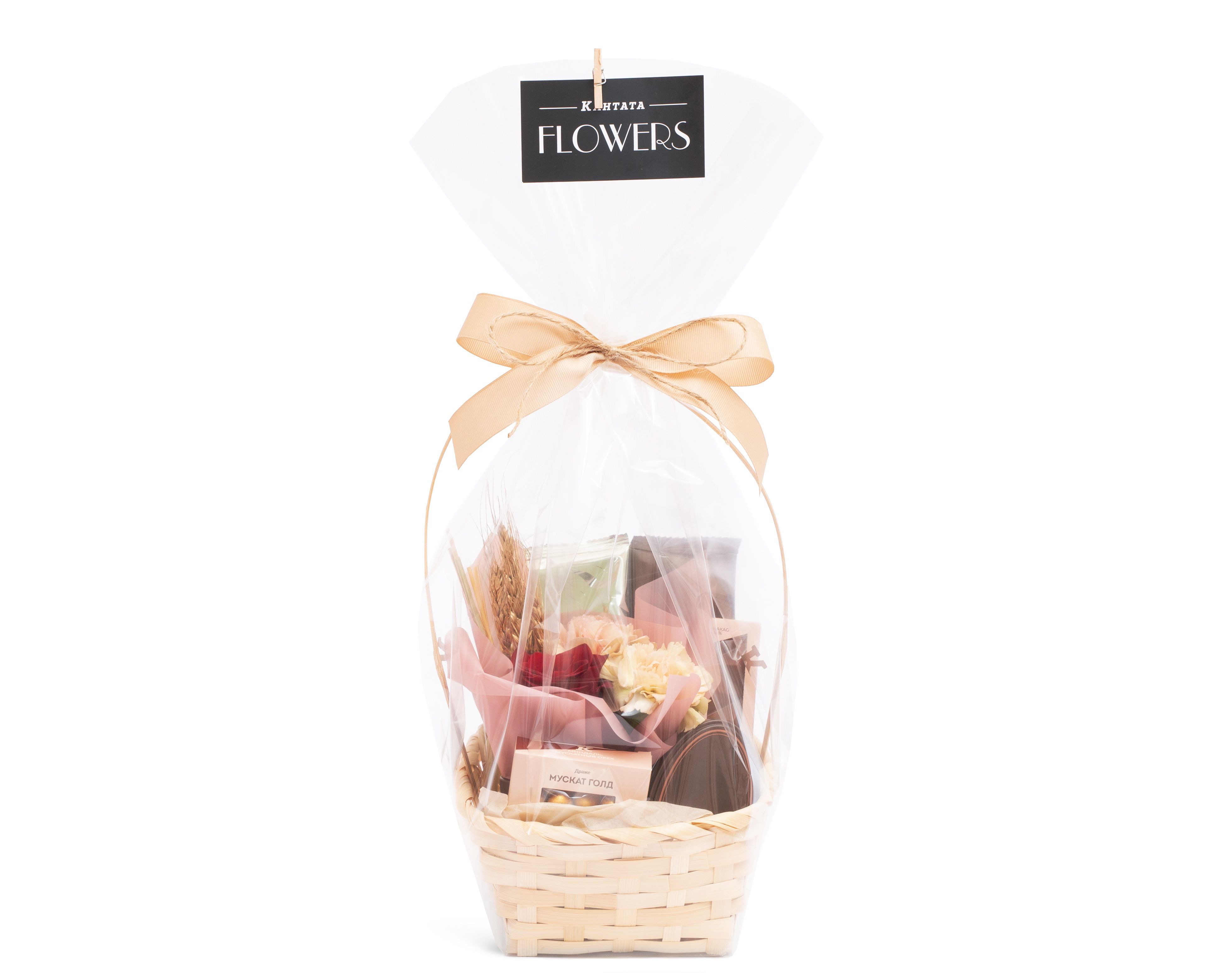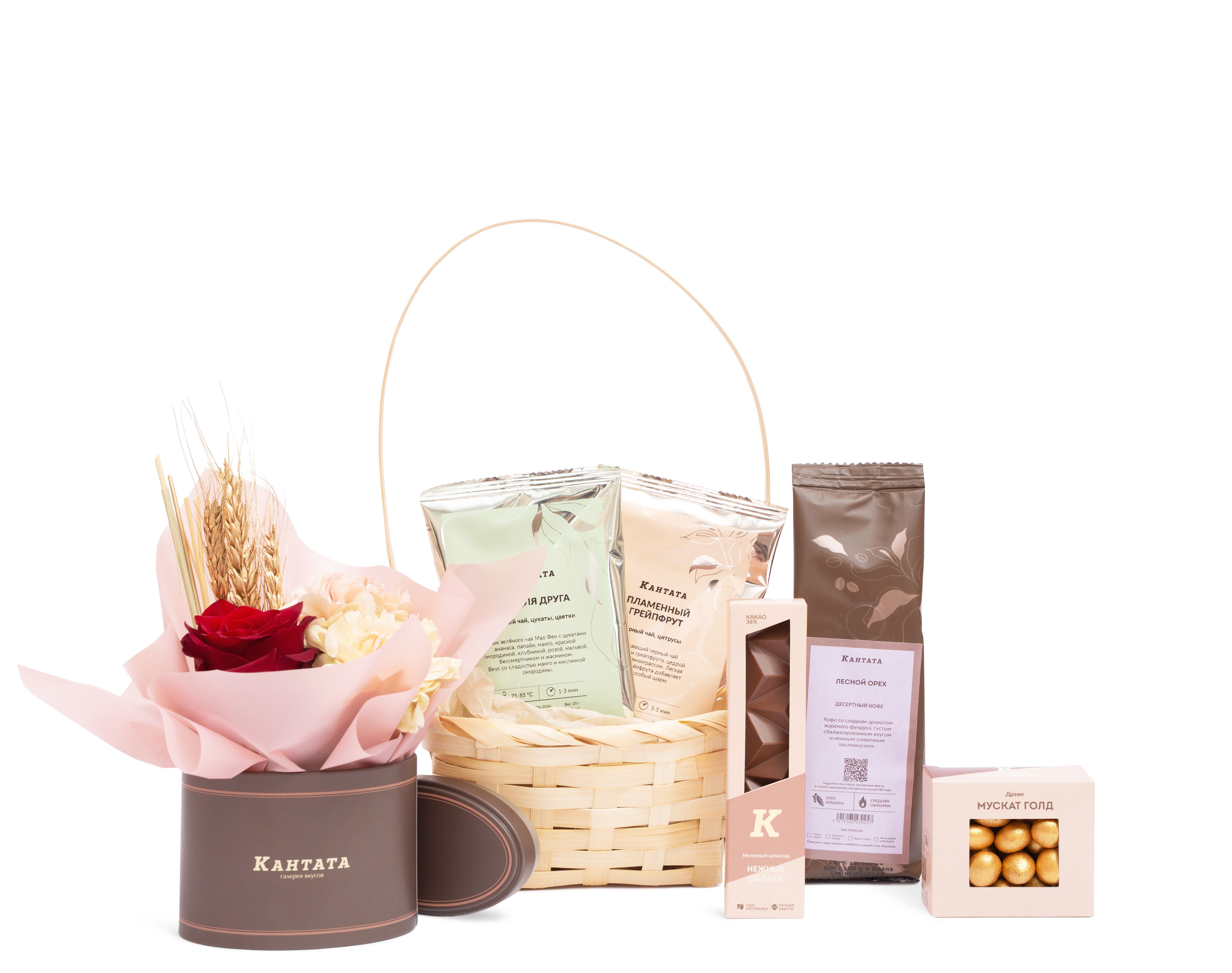 Воздушная корзина, в центре которой — живые розы и гвоздика, а вокруг — зеленый «Чай для друга» с сочными цукатами, черный «Пламенный грейпфрут» с огненным ароматом цитруса и зерновой кофе «Лесной орех» с насыщенным бодрящим вкусом. На десерт — изысканные золотистые драже с орехами и плитка молочного шоколада, чтобы дополнить вкусы согревающих напитков.