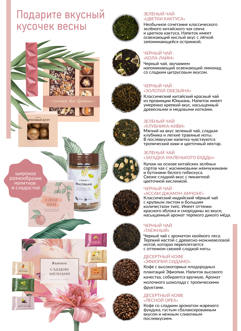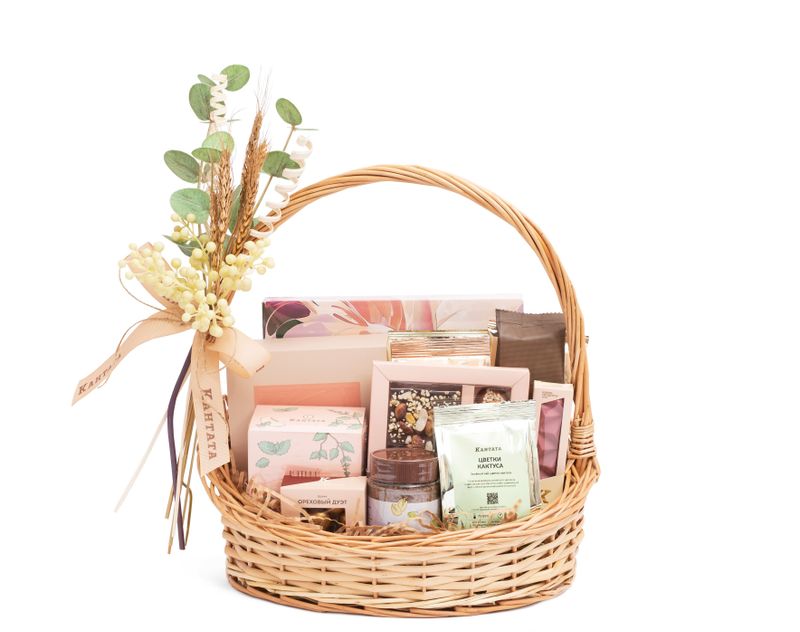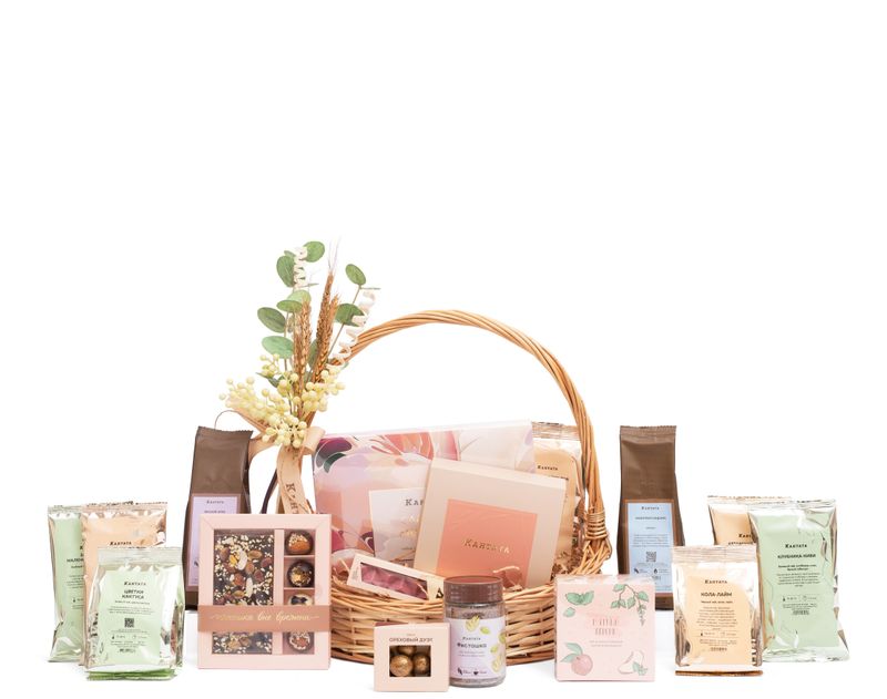 Подарите яркое впечатление вместе с этой роскошной корзиной! Внутри — восемь сортов чая и три сорта кофе, среди которых найдутся как классические, так и десертные напитки под любое настроение: пряные, ягодные, сливочные и не только. Набор из шести видов шоколада станет настоящим гурмэ-открытием для того, кто любит дополнять чашечку горячего напитка сладким акцентом. Также в этом помогут редкий рубиновый шоколад и набор темного шоколада с фисташкой и гималайской солью.