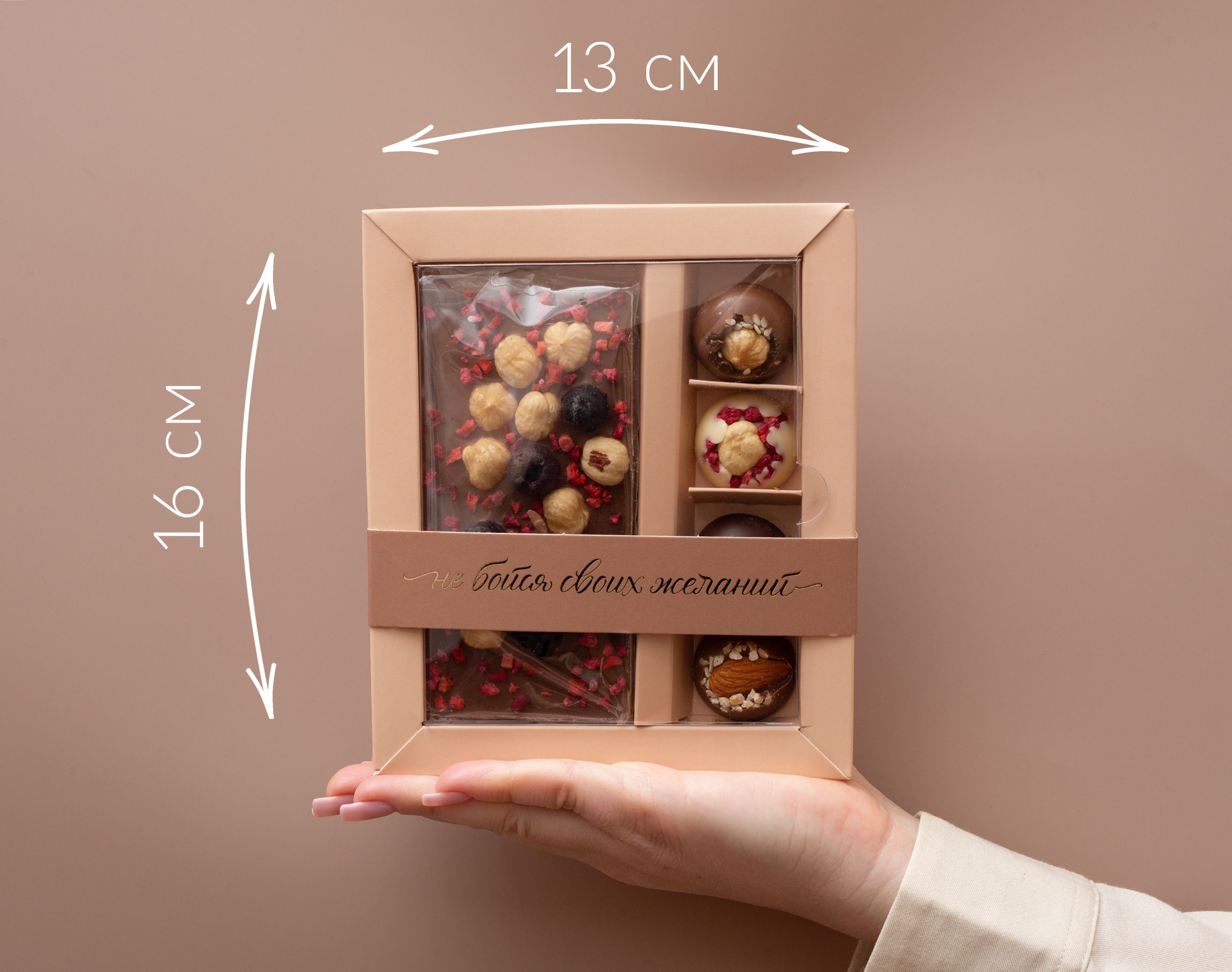 Не бойтесь своих вкусных желаний! В наборе: молочный шоколад с фундуком и ягодами, нежная сладость шоколада оттеняется свежей кислинкой ягод, и четыре конфеты в ярком оформлении с уникальными вкусами.