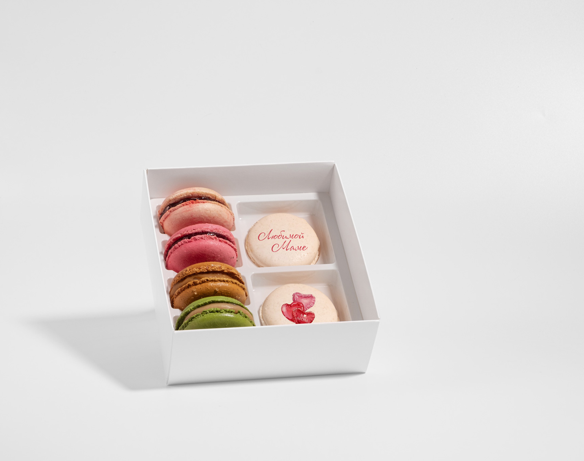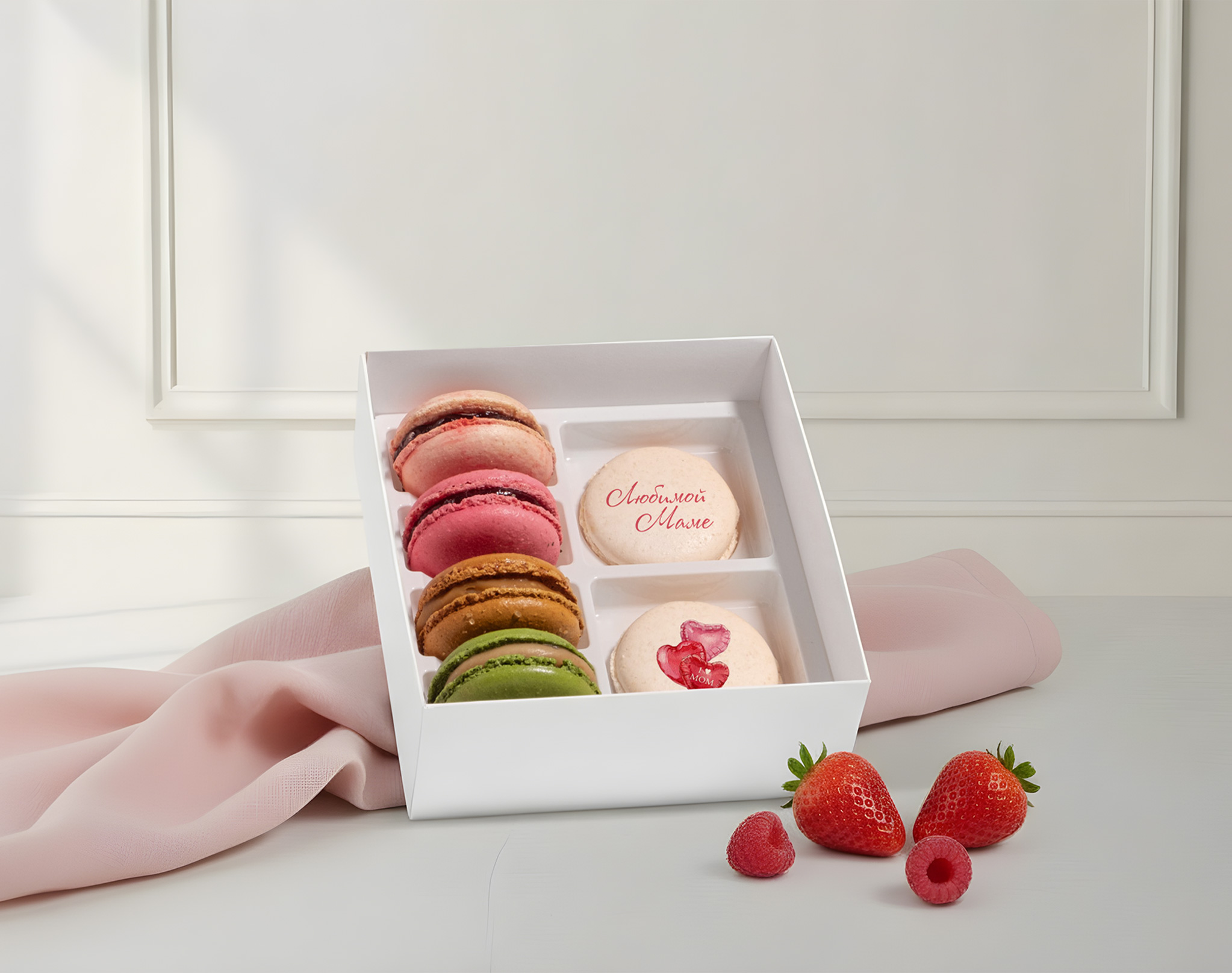 Что может быть удивительнее, чем нежный французский десерт в праздничное утро? Особенно, если он со вкусом вашей к маме любви и трепетными словами на пирожных. Вариант легкого завтрака из 6 ярких макаронов, ароматный свежесваренный кофе и ваши крепкие объятия — такие простые, но такие важные знаки внимания!