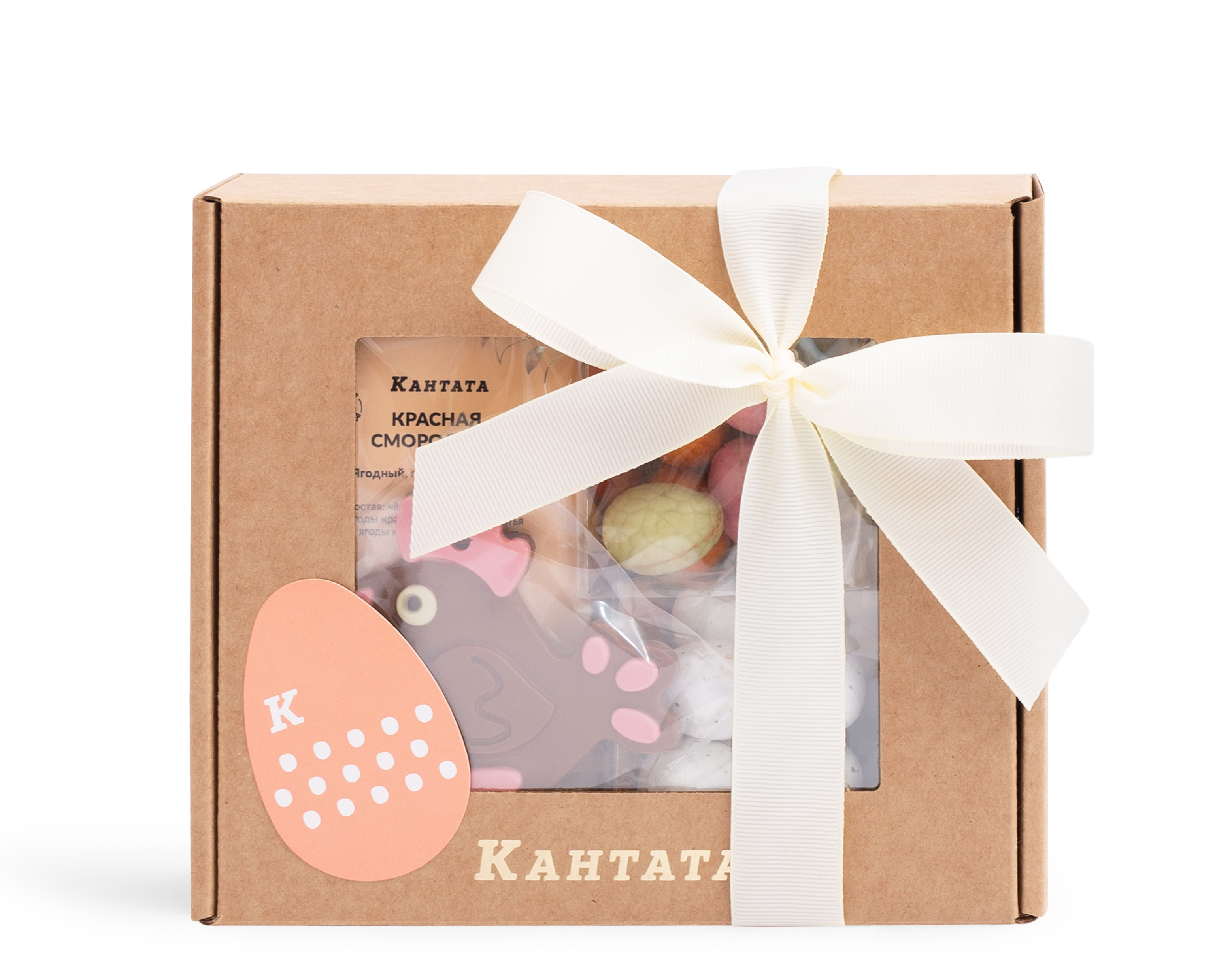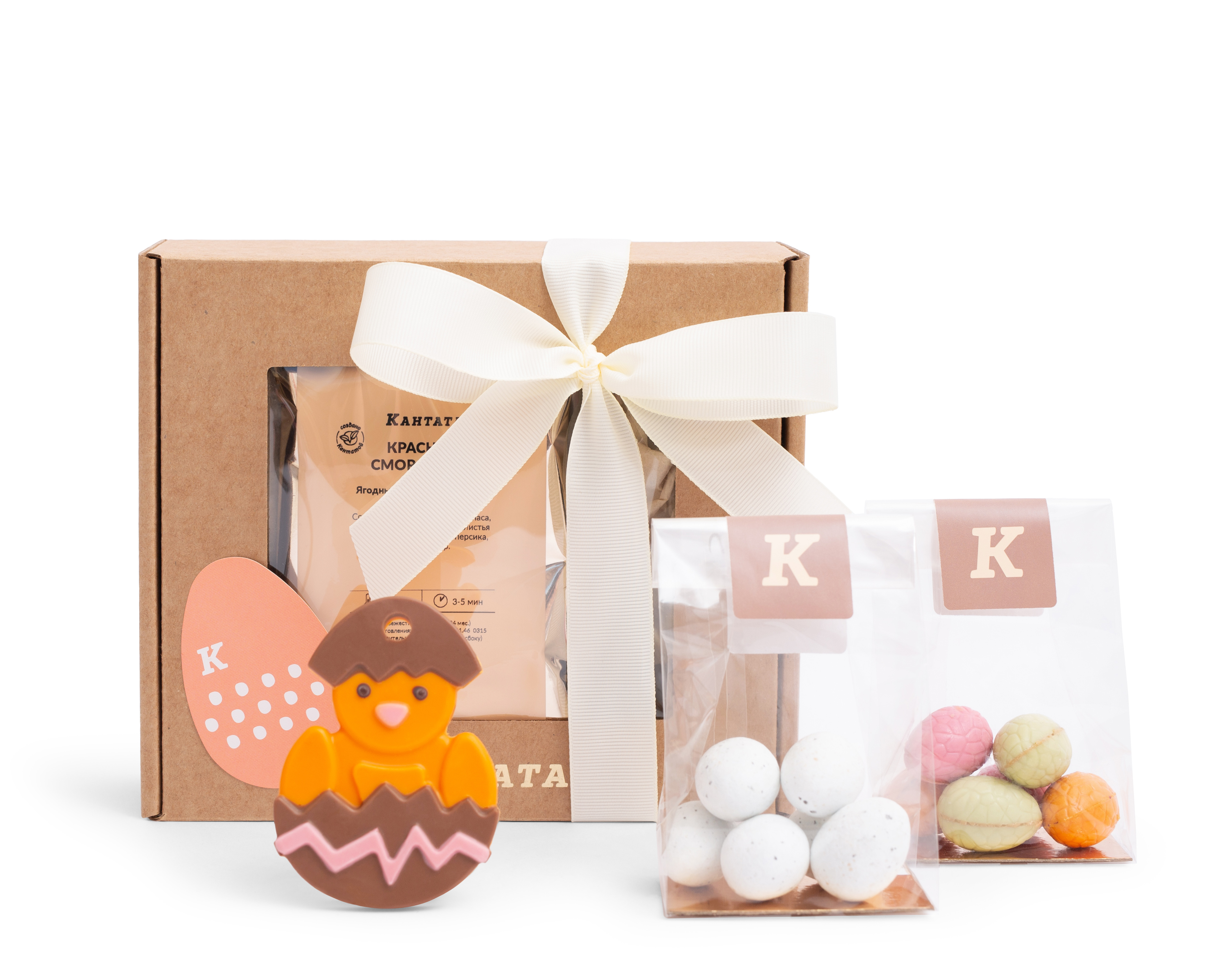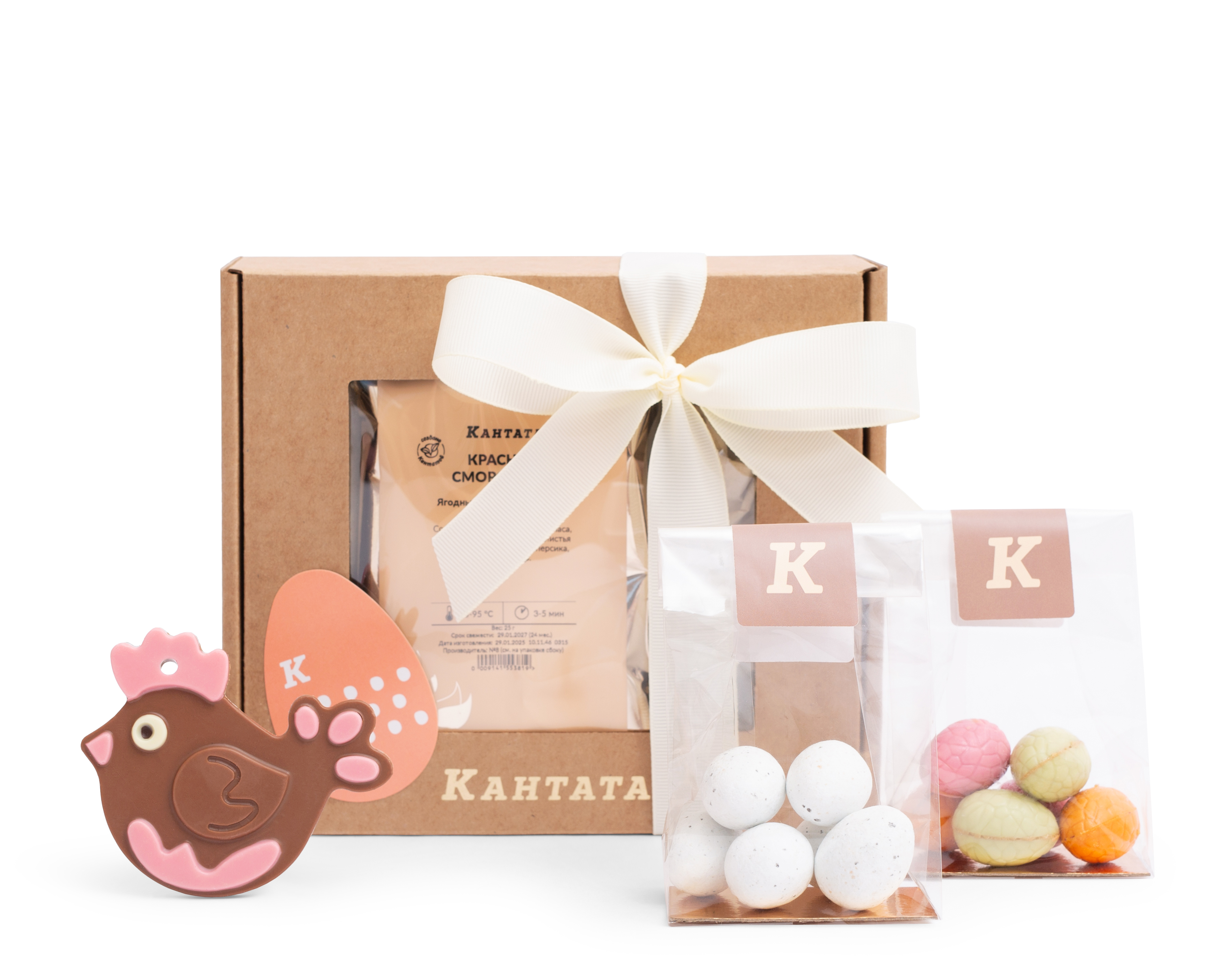 Состав: драже в сахарном корпусе «Белый талисман» (ГОСТ 7060-2020), 50 г: молочный шоколад (тростниковый сахар, какао-масло, какао тертое, сухое цельное молоко, эмульгатор: соевый лецитин; натуральный ароматизатор: ваниль), паста из фундука, рисовые шарики (мука рисовая, мука пшеничная хлебопекарная, сахар, соль), сахар, вода, мальтодекстрин, какао-масло, красители: уголь растительный, диоксид титана (Е171); корпусные конфеты «Акварель» (ТУ 10.82.20-001-13235986-2017), 42 г, зеленое яйцо: белый шоколад (сахар, какао-масло, сухое цельное молоко, эмульгатор: соевый лецитин, натуральный ароматизатор: ваниль), ореховая паста из фисташки, рисовые шарики (мука рисовая, мука пшеничная хлебопекарная, сахар, соль), чай "Матча"; оранжевое яйцо: белый шоколад со вкусом апельсина (сахар, какао-масло, сухое цельное молоко, эмульгатор: соевый лецитин; натуральный ароматизатор: апельсин; красители: бета-каротин, кармин; натуральный ароматизатор: ваниль), ореховая паста из миндаля, вишня сублимированная; розовое яйцо: белый шоколад со вкусом клубники (сахар, какао-масло, сухое цельное молоко, эмульгатор: соевый лецитин; ароматизатор: клубника; краситель: кармин; натуральный ароматизатор: ваниль), ореховая паста из миндаля, клубника сублимированная; тематическая фигурка (ТУ 10.82.22-001-13235986-2022), 25 г: «Курочка»: молочный шоколад (тростниковый сахар, какао-масло, какао тертое, сухое цельное молоко, эмульгатор: соевый лецитин; натуральный ароматизатор: ваниль), белый шоколад со вкусом клубники (сахар, какао-масло, сухое цельное молоко, эмульгатор: соевый лецитин; ароматизатор: клубника; краситель: кармин; натуральный ароматизатор: ваниль), белый шоколад (сахар, какао-масло, сухое цельное молоко, эмульгатор: соевый лецитин; натуральный ароматизатор: ваниль), темный шоколад (какао тертое, тростниковый сахар, какао-масло, эмульгатор: соевый лецитин; натуральный ароматизатор: ваниль); или «Морковка»: молочный шоколад (тростниковый сахар, какао-масло, какао тертое, сухое цельное молоко, эмульгатор: соевый лецитин; натуральный ароматизатор: ваниль), белый шоколад со вкусом апельсина (сахар, какао-масло, сухое цельное молоко, эмульгатор: соевый лецитин; ароматизатор: апельсин; красители: бета-каротин, кармин; натуральный ароматизатор: ваниль), темный шоколад (какао тертое, тростниковый сахар, какао-масло, эмульгатор: соевый лецитин; натуральный ароматизатор: ваниль); или «Птенчик»: белый шоколад со вкусом апельсина (сахар, какао-масло, сухое цельное молоко, эмульгатор: соевый лецитин; ароматизатор: апельсин; красители: бета-каротин, кармин; натуральный ароматизатор: ваниль), молочный шоколад (сахар, какао-масло, сухое цельное молоко, эмульгатор: соевый лецитин; натуральный ароматизатор: ваниль), белый шоколад со вкусом клубники (сахар, какао-масло, сухое цельное молоко, эмульгатор: соевый лецитин; ароматизатор: клубника; краситель: кармин; натуральный ароматизатор: ваниль), темный шоколад (какао тертое, тростниковый сахар, какао-масло, эмульгатор: соевый лецитин; натуральный ароматизатор: ваниль); чай «Красная смородина», 25 г: ассам TGFOP, цукат ананаса, ягоды красной смородины, листья и ягоды малины, бутоны персика, ароматизатор.
