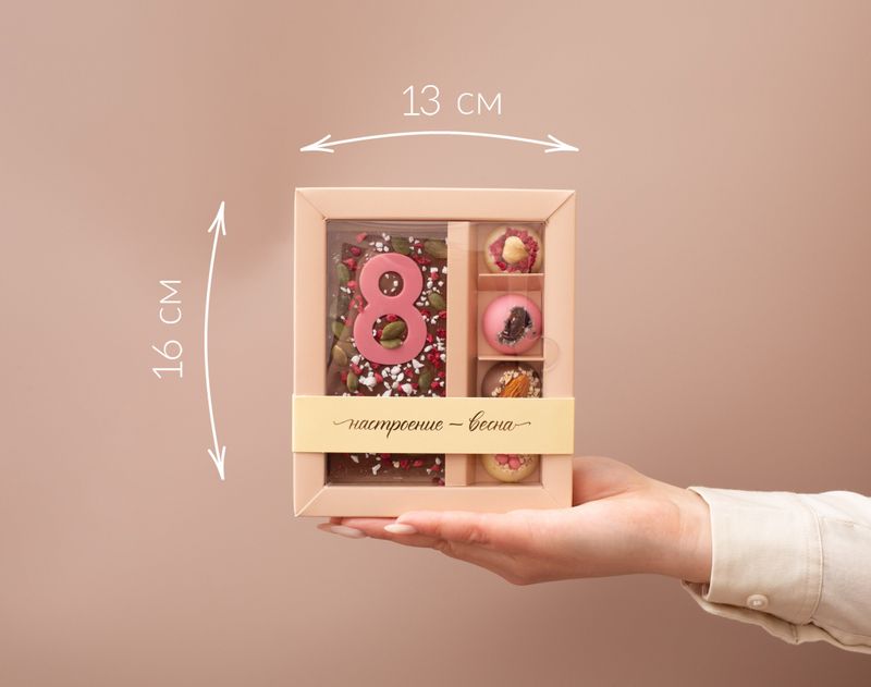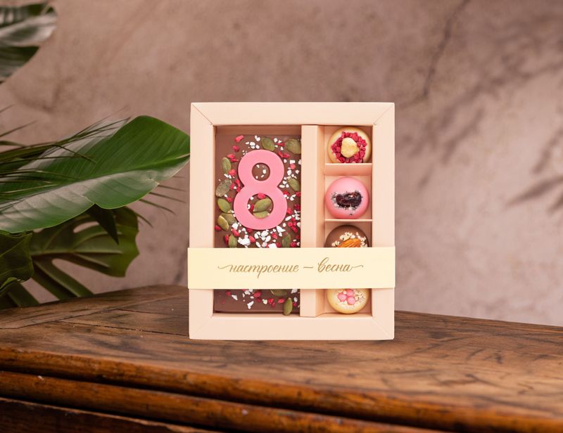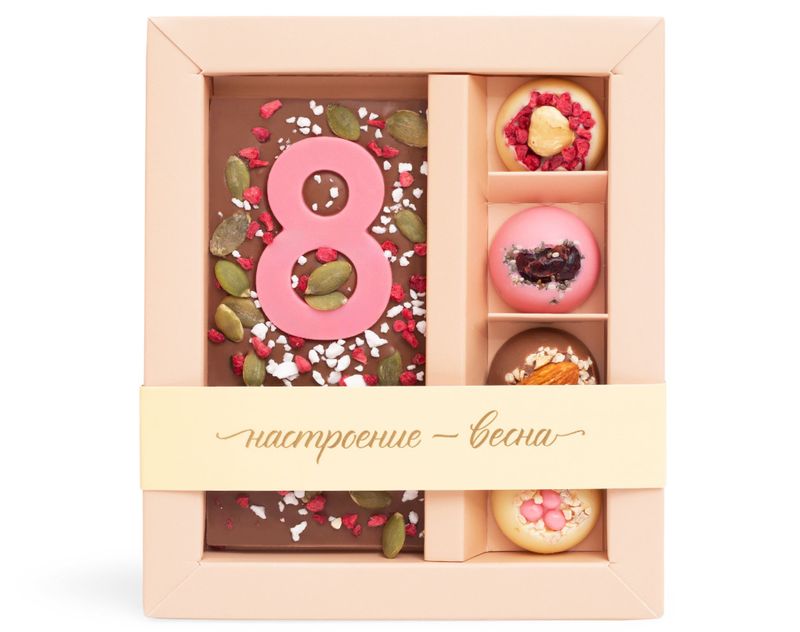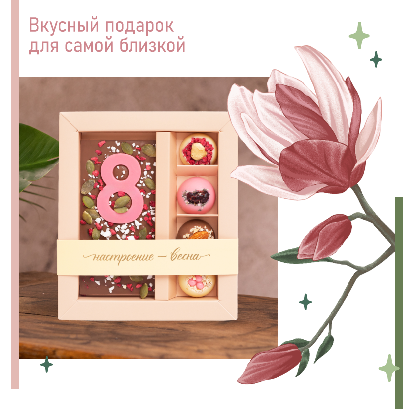 Весеннее оформление, свежесть сублимированных ягод и хрустящие ингредиенты — это то, что делает праздничный набор подходящим вариантом для подарка прекрасной половине человечества.
