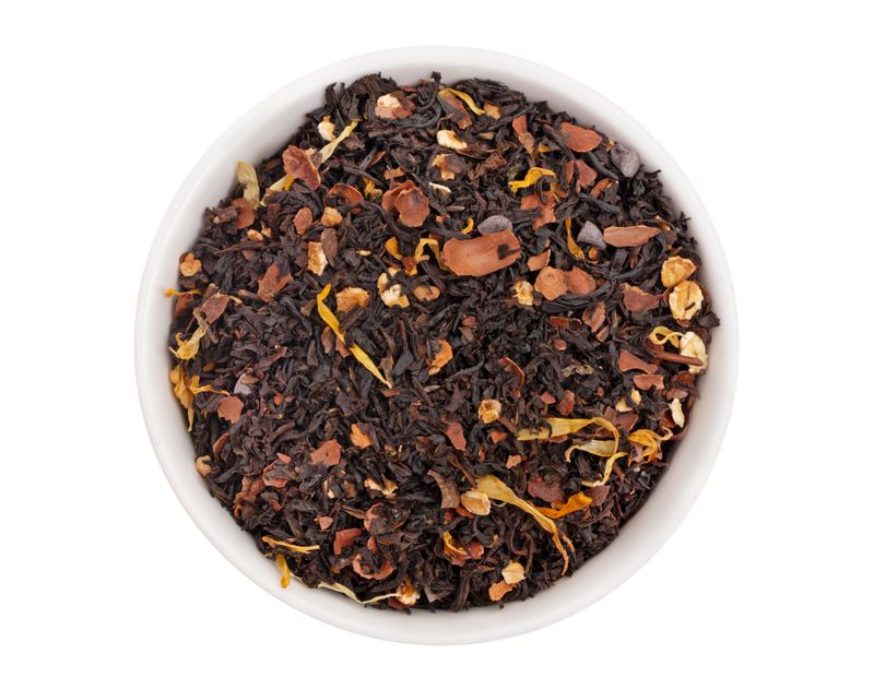 Состав: чёрный чай, какао велла, ореховый сахар (фундук, сахар), безглютеновый овёс, кусочки шоколада (какао-масса, сахар, какао-масло), кусочки нуги (бельгийский молочный шоколад: сахар, сухое цельное молоко, какао-масло, какао-масса, эмульгатор — соевый лецитин, натуральный ванильный ароматизатор), обезвоженные сливки, фисташка, цветки календулы, ароматизатор.