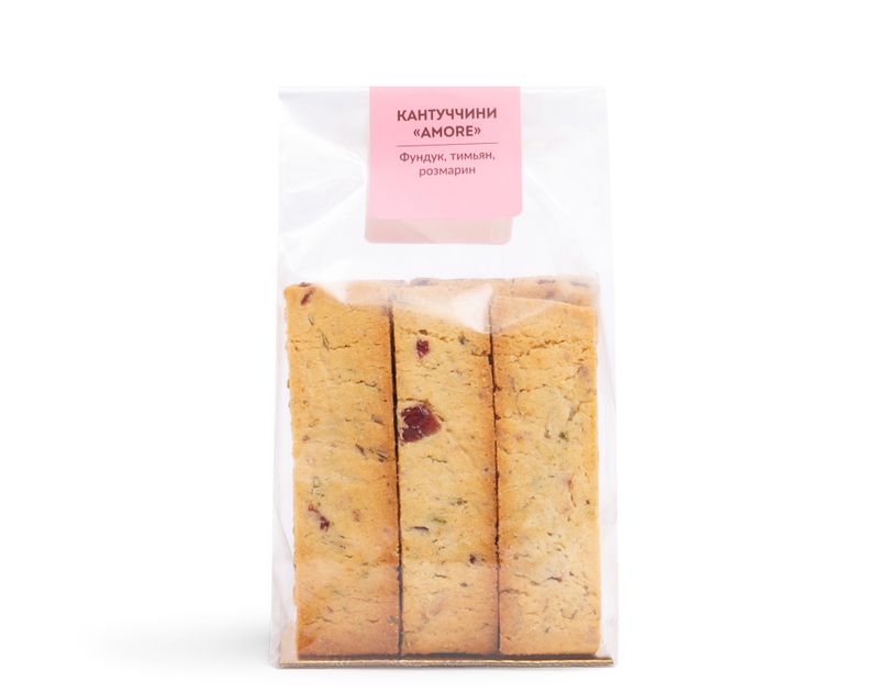 Кантуччини – особый вид печенья родом из Тосканы. Традиционно употребляется с вином. «Amore», в переводе с итальянского, значит «любовь». Пряное печенье с отборным фундуком, тимьяном и розмарином.