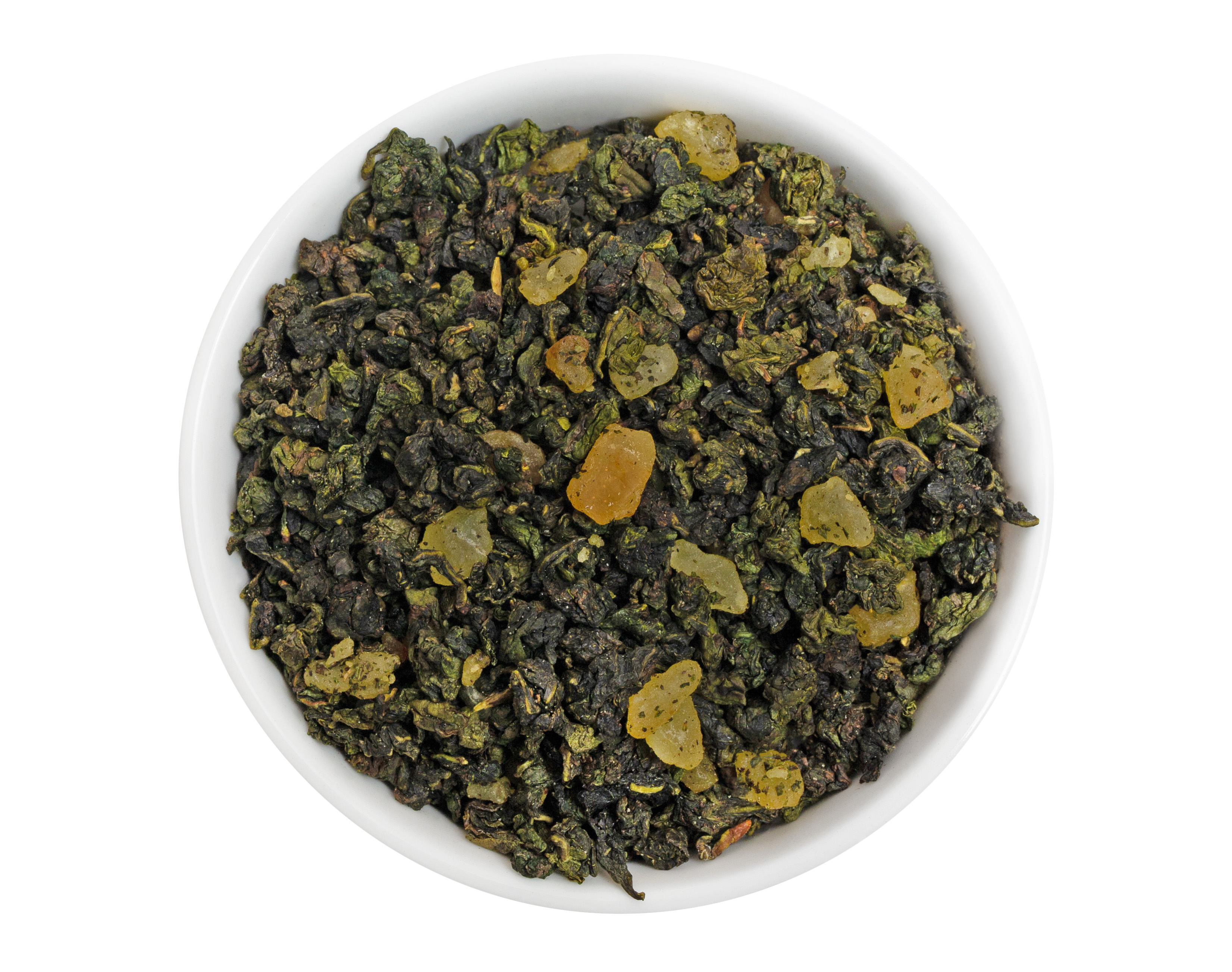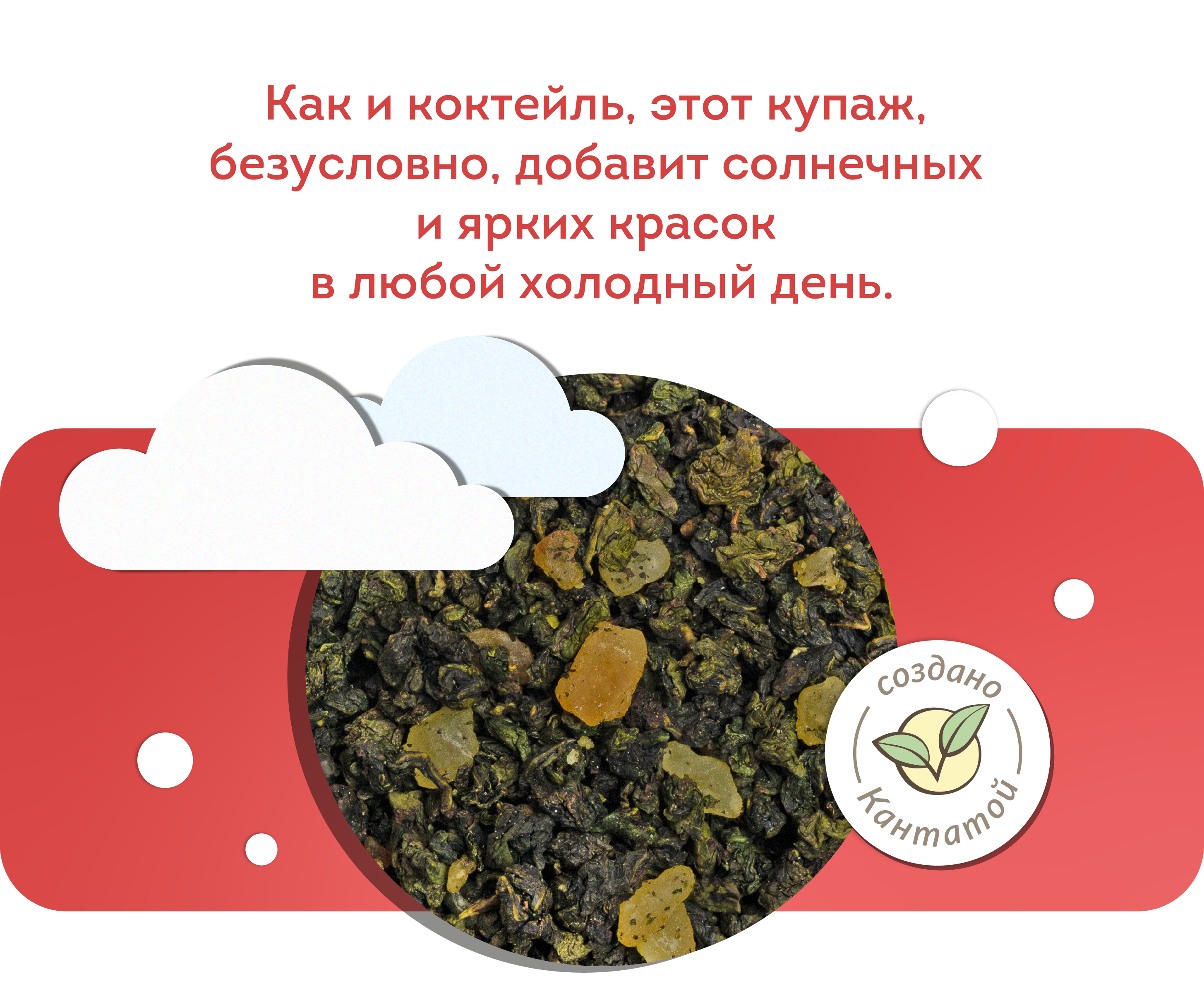 Состав: светлый улун Мао Се, цукаты персика, цукаты мандарина, ароматизатор.