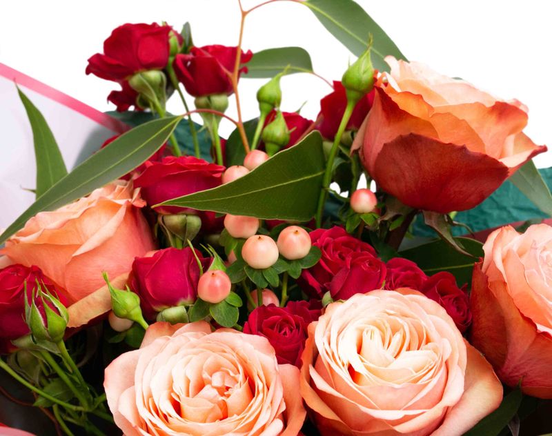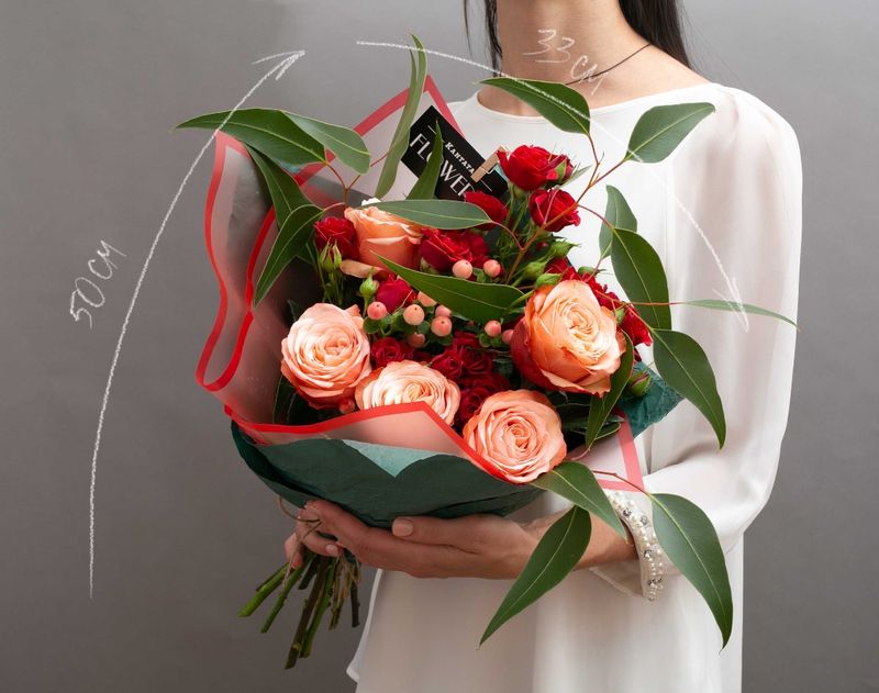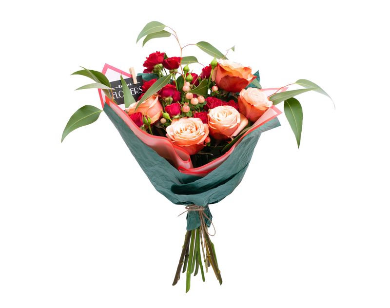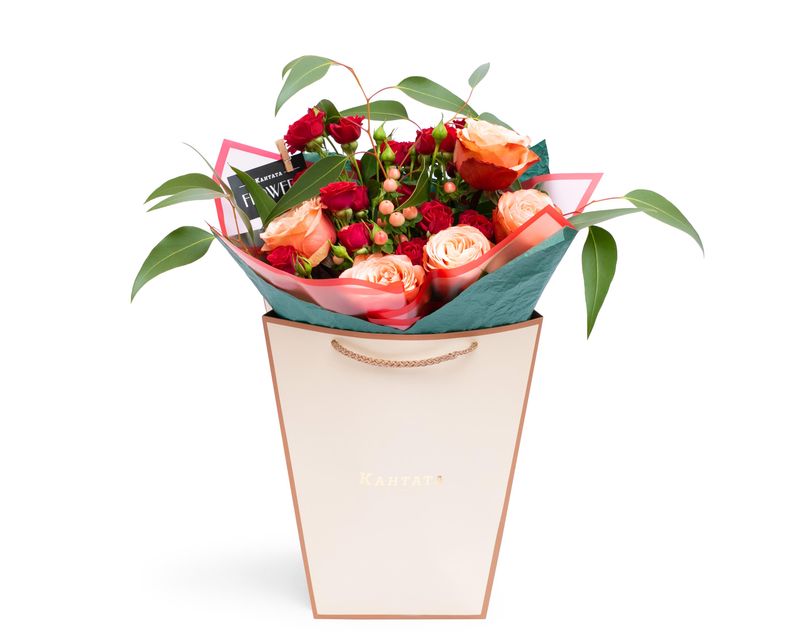 Живые цветы среди зимы – это настоящее чудо! В этом изящном букете мы собрали композицию из живых ароматных роз, дополнили цветы эвкалиптом и веточками гиперикума.
