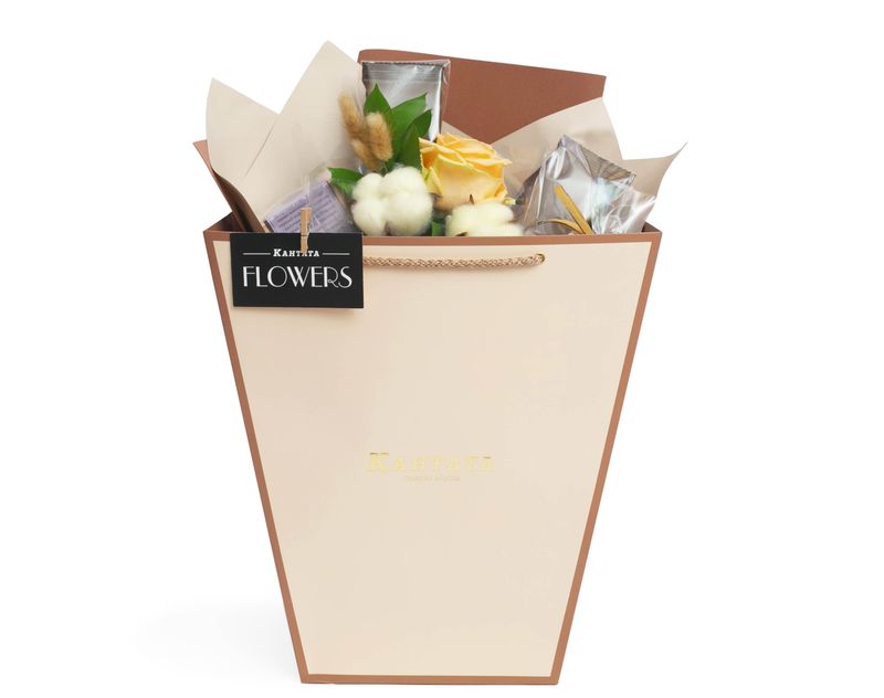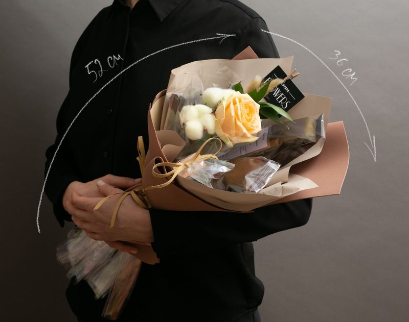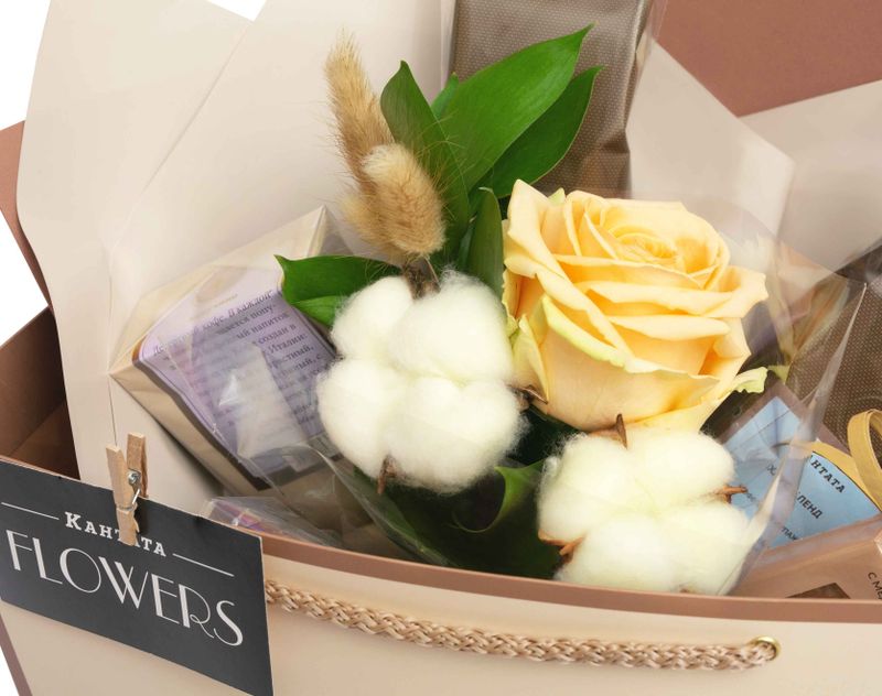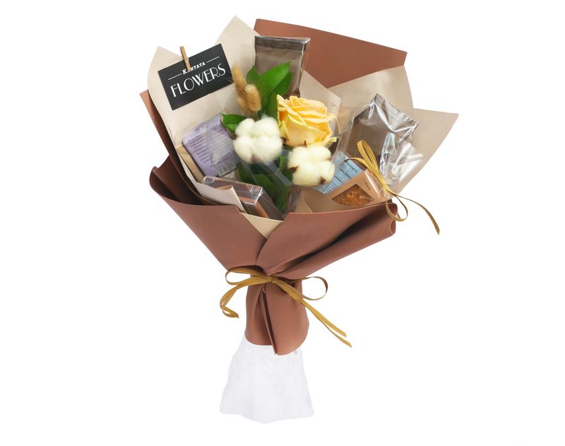 Изящный букет с живыми розами, полный приятных сюрпризов. В набор мы положили три вида кофе – десертные «Шоколад Вишня» и «Капучино», а к ним – классический купаж «Хаус Бленд». На десерт в подарке найдутся нежная нуга и набор джандуй в шоколаде.