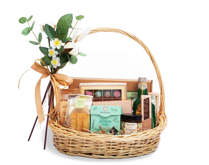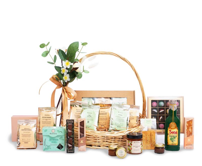 Изысканное сочетание вкусов и ароматов в великолепной корзине, полной чая и десертов! В подарке – пять видов зеленого и шесть видов ароматного черного чая, в коллекции – десертные купажи и классические сорта на любой вкус. На десерт в корзине – превосходная линейка сладостей ручной работы. Это набор «Маленькие радости» из шести баночек с разными десертами, тающий во рту шокобар с фисташкой и сытная нуга «Маскарпоне», мармелад из экзотических фруктов, хрустящее печенье-кантуччини, плитка молочного шоколада «Нежные облака» и набор из шестнадцати конфет. К напиткам или выпечке – мед-бальзам «Горная липа» с приятным сладким вкусом и ярким ароматом.
