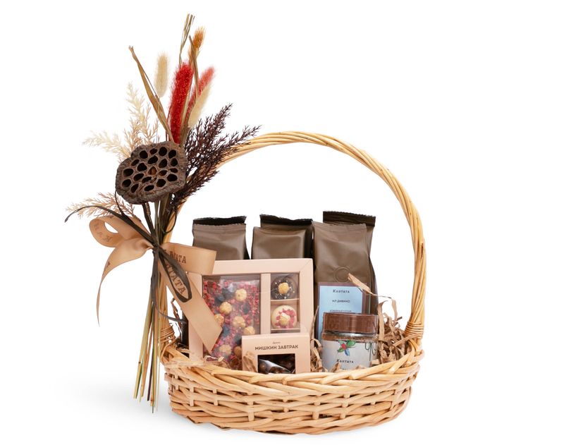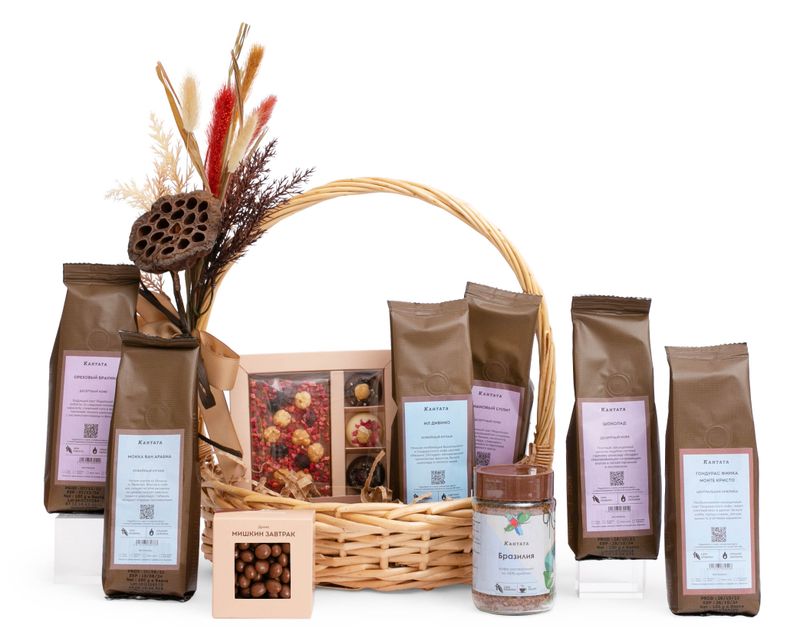 Насыщенный бодрящий кофе — любимая классика! В этом изящной подарке мы собрали семь его видов — как классические, так и десертные сорта на любой вкус. К согревающим напиткам добавили десерты — драже «Мишкин завтрак» с кедровым ядрышком под слоем молочного шоколада, а также набор молочного шоколада с фундуком и ягодами «Классика».