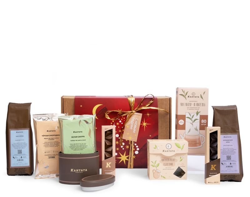 В Новый год, кажется, возможно исполнение всех желаний и чудес! Пусть этот подарок станет символом волшебства для дорогого вам человека. В этом праздничном наборе – нежный молочный улун «Огненный цветок», купаж черного чая «Черная смородина» с приятным сладким звучанием, зеленый чай «Белая сакура» с яркой нотой вишни и цветов, а также два сорта кофе – «Ирландский крем» со сливочной нотой жгучего виски и «Хаус Бленд», сорт, на котором любой напиток получится таким вкусным, словно его приготовили в лучшей кофейне города. Чтобы любимый напиток надолго сохранил вкус и аромат, в подарок мы добавили стильную жестяную баночку для хранения, а для чаепитий – индивидуальные заварочные фильтр-пакеты. На десерт – две плитки шоколада: «Нежные облака» и «Колумбия», которые своим контрастом дополнят напитки и изящную композицию этого подарка.