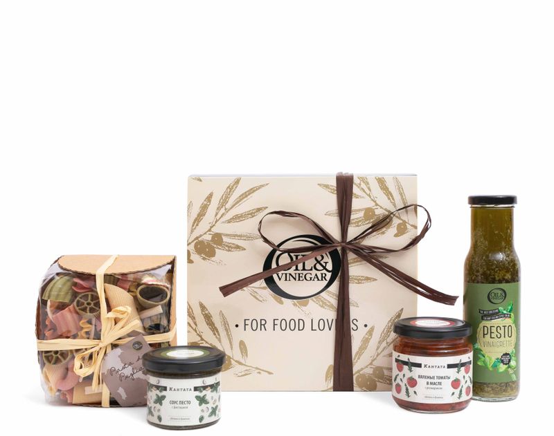 Подарок для вкусного ужина! В набор мы поместили необычную пасту Апулию, а к ней — соус песто с фисташкой и душистую заправку «Песто», а также аппетитные вяленые томаты в баночке.
