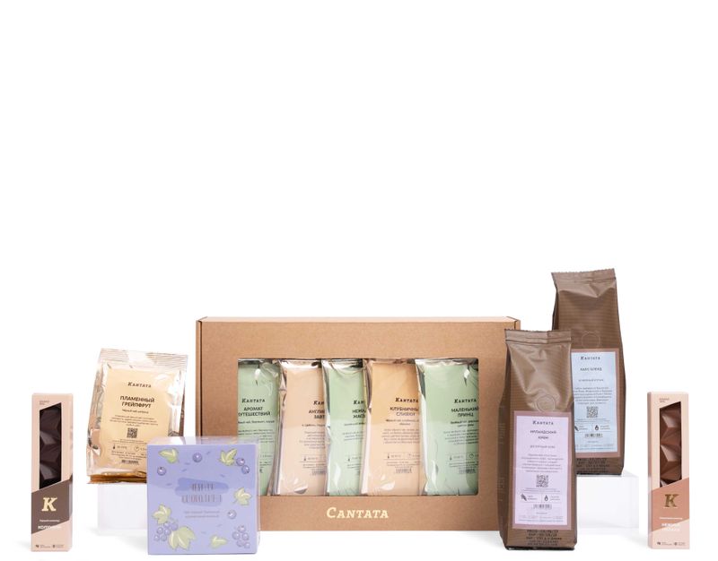 Запоминающийся дизайн этого бокса точно останется приятным воспоминанием! Внутри мы собрали целую коллекцию напитков — в подарке найдутся как десертные, так и классические сорта: семь видов чая и два вида кофе. Шокобары «Нежные облака» и «Колумбия» из отборных какао-бобов станут великолепным дополнением согревающих напитков.