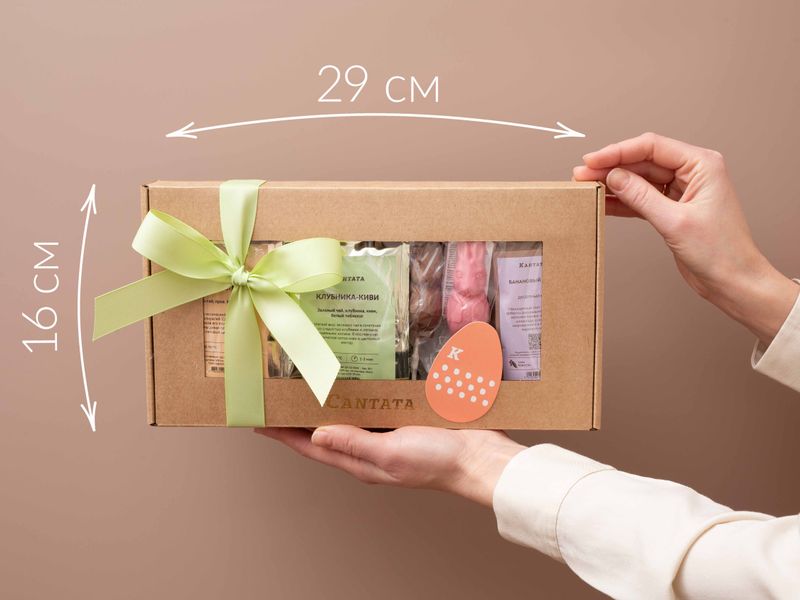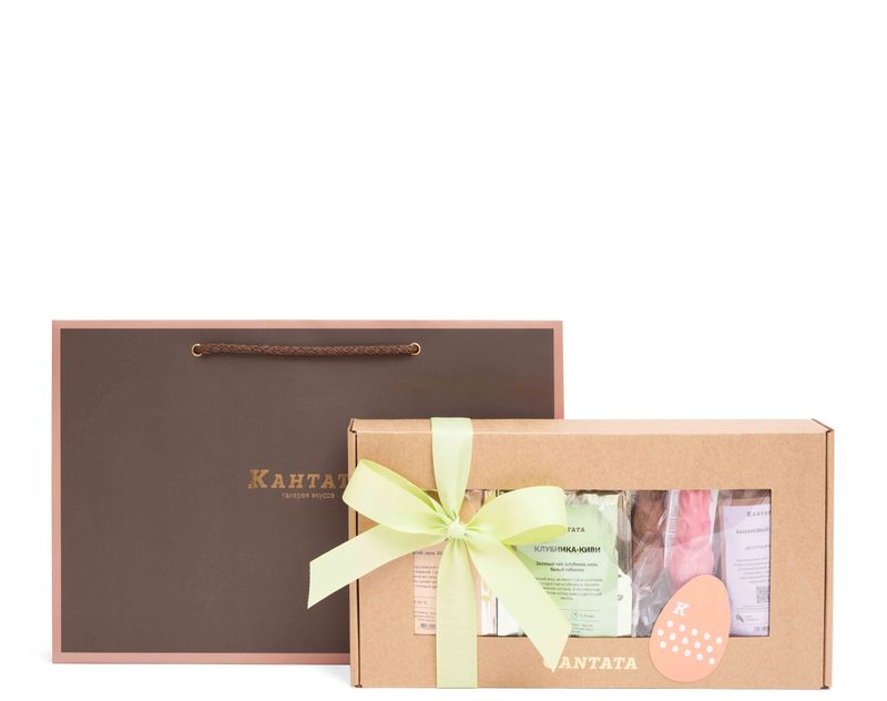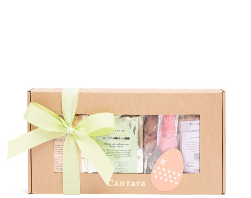 Очаровательный подарок на Пасху! Внутрь приятной крафтовой коробки мы поместили три ароматных напитка – весенний купаж зеленого чая «Клубника-Киви», благородный черный чай «Золотые спирали» и аппетитный десертный кофе «Банановый Сплит». На десерт – дуэт задорных Братцев Кроликов, выполненных из клубничного и молочного шоколада.