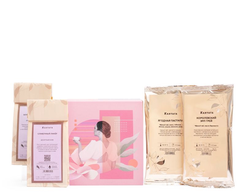 Изящный подарок, полный неповторимых вкусов! В этом наборе собраны четыре ароматных напитка — черный чай «Королевский Эрл Грей» со знаменитой нотой бергамота и «Ягодная пастила» с оттенком сочной вишни, а также два вида кофе — сорта «Сливочный ликёр» и «Шоколад Вишня» с неповторимым десертным ароматом.