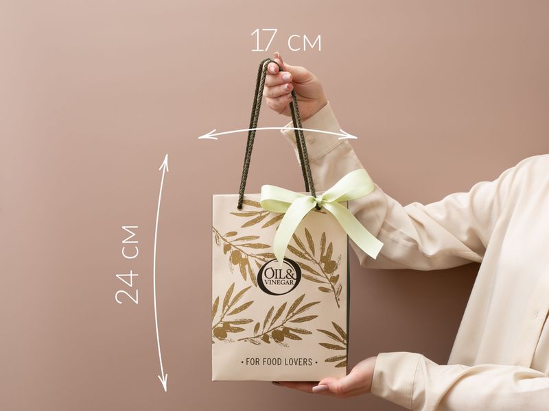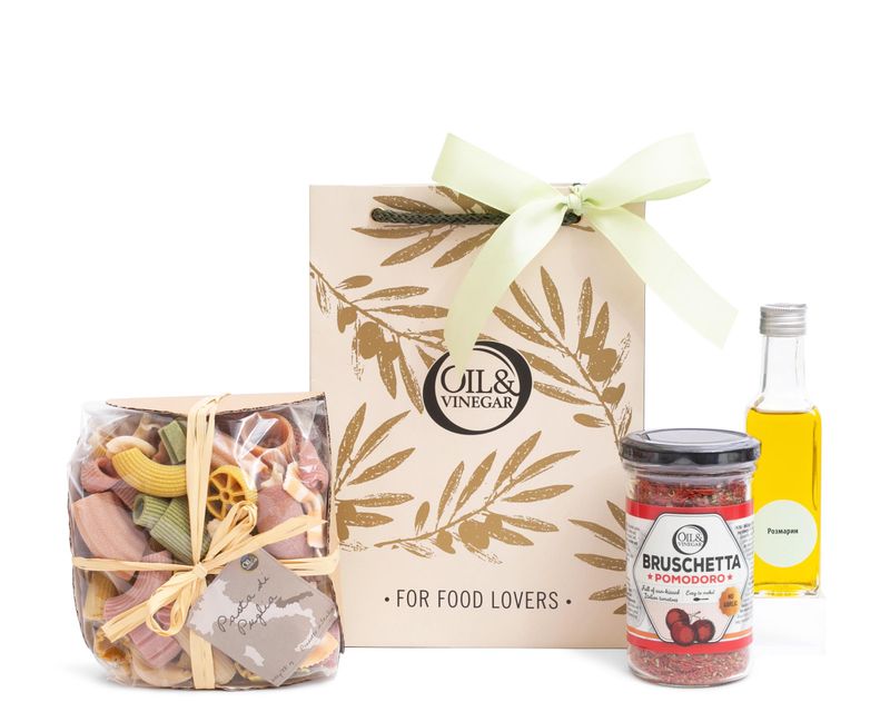 В этой сумочке — аппетитный гарнир для вашего застолья: изысканная паста «Апулия» и ароматное оливковое масло с розмарином, а также брускетта с помидором для создания кулинарных шедевров.