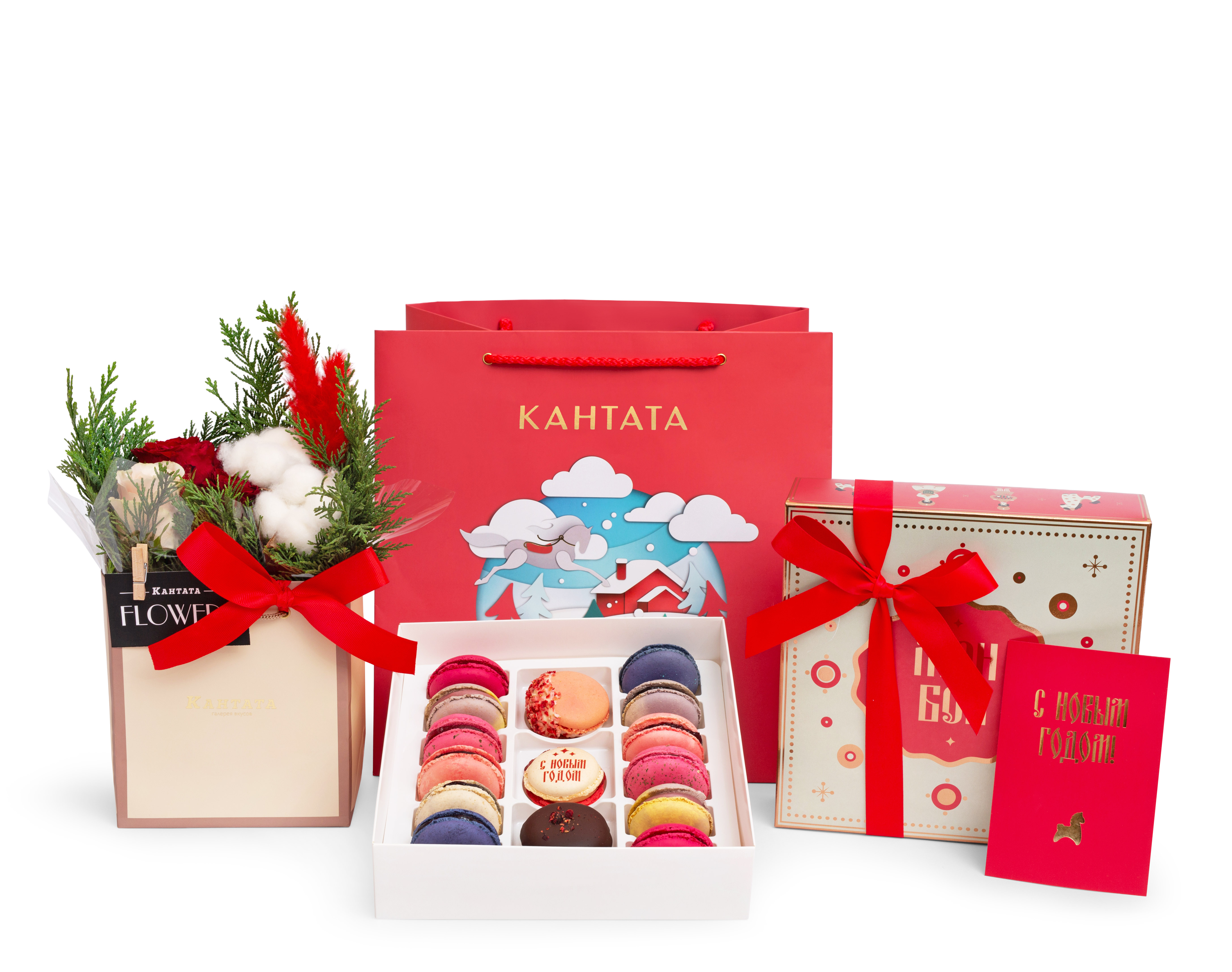 Подарок создаёт зимний праздник: живая зелень, хлопковые акценты и яркие детали придают композиции уют и атмосферу предвкушения, а праздничные монбоны добавляют сладкое удовольствие и делают подарок тёплым, стильным и по-настоящему запоминающимся.