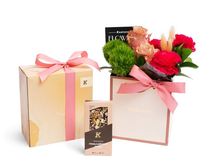Прекрасный подарок для ценителя чая! В наборе, который мы украсили композицией из живых ароматных цветов, собрана коллекция из самых вкусных и популярных чаёв из ассортимента Кантаты. К напиткам — тёмный шоколад «Гималайские горы» с фисташкой и пикантной солёной нотой.