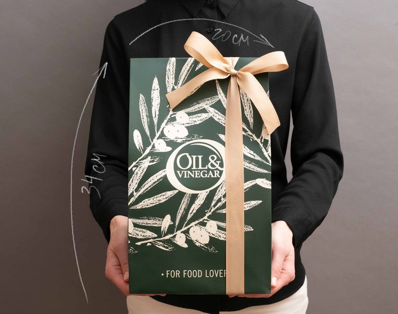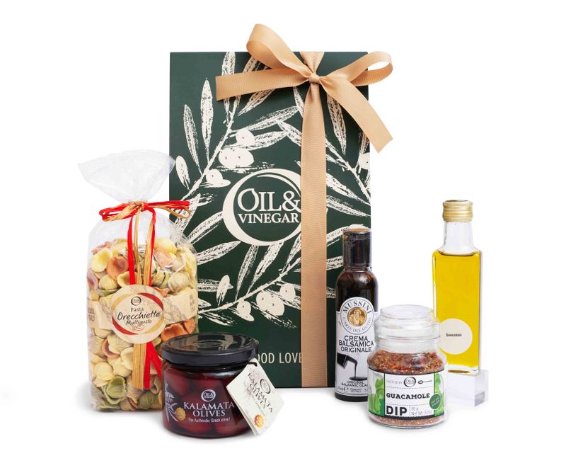 В подарок мы положили итальянскую пасту Орекьетте Мультигусто в форме маленьких ушек, ароматную смесь «Гуакамоле Дип», изысканный густой бальзамический уксус и ароматное оливковое масло «Бонсекко». Дополнили подарок деликатесом – оливками Каламата в баночке.