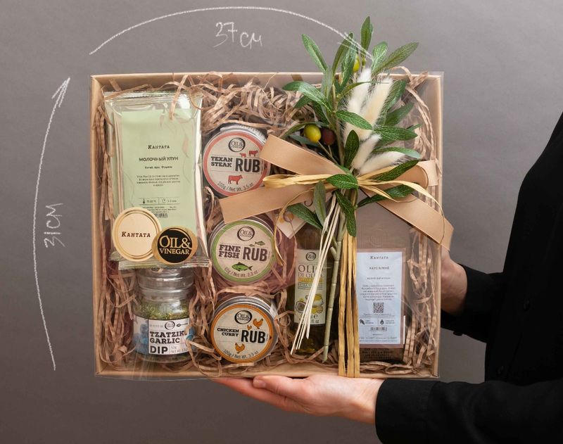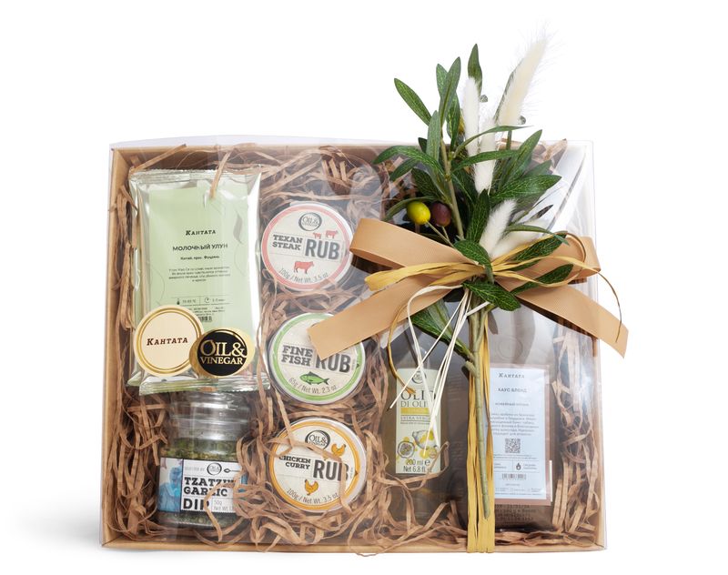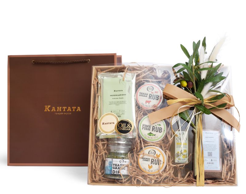 Идеальное сочетание гурмэ-ингредиентов и ароматных напитков! В подарке – три смеси трав для стейка, рыбы и курицы, которые сделают блюда поистине изысканными. К ним – оливковое масло с яркой нотой лимона и традиционный греческий дип «Цацики» с чесноком. После сытного ужина компанию составят ароматные напитки – нежный сливочный «Молочный улун», купаж черного чая со сладкой нотой «Черная смородина» и классический чай «Зеленая улитка» с цветочно-лимонным ароматом. А также два вида кофе – классический купаж арабики «Хаус Бленд» и сливочный «Ирландский крем» с согревающей нотой отборного виски.