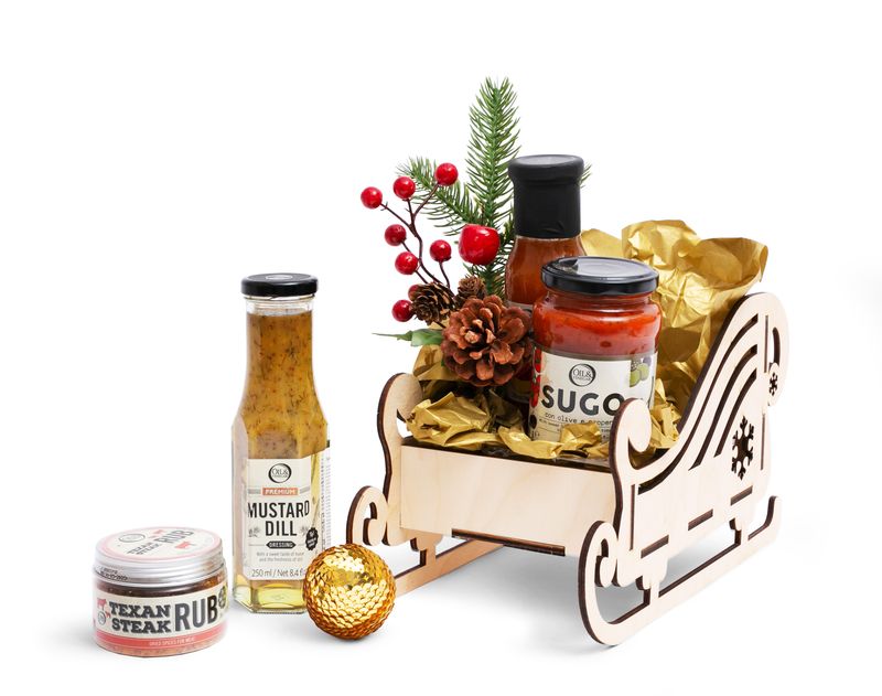 Волшебные сани, которые везут чудесное гурмэ-впечатление! В подарке есть все для создания праздничной атмосферы, даже золотистый шарик на елочку. А также смесь трав «Стейк по-техасски» для приготовления мяса на гриле, два соуса – с ярким манго и перчиком чили и соус «Суго» с оливками, а также заправка с горчицей и укропом. Широкий выбор неповторимых вкусов для самых аппетитных блюд!