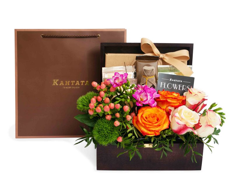 Деревянная шкатулка, в которой мы собрали целую коллекцию вкусов и ароматов. Подарок украшен живыми цветами, состоит из четырех видов чая на любой вкус, а также ароматного сорта кофе. На десерт в набор мы добавили успокаивающий мед-бальзам на основе трав, который можно добавлять в напитки или украшать им выпечку. Также в шкатулке найдется ассорти пьянящих конфет из «Барной коллекции».