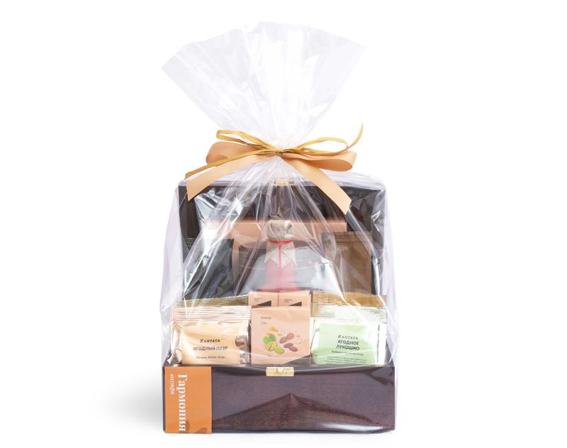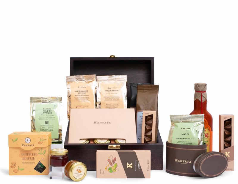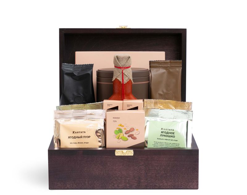 В стильной деревянной шкатулке – широкий выбор любимых напитков и десертов. В подарок мы вложили пять видов чая на любой вкус, а к ним – два вида кофе классического и десертного сорта. Чтобы любимый напиток надолго сохранил вкус и аромат, дополнили набор стильной баночкой для хранения. Десертов в шкатулке – настоящая коллекция! Это набор из шести баночек с крем-карамелью, мармеладом и ореховой пастой «Маленькие радости», плитка полезного шоколада «Спорт» с орехами и изюмом, два шокобара и мед-бальзам «Ягодная сказка», который можно добавить в любимый напиток или украсить им выпечку.