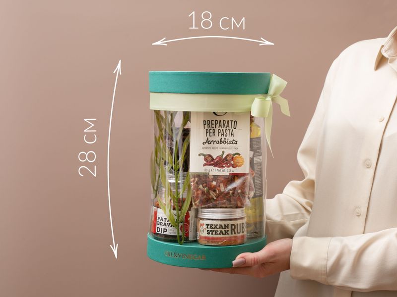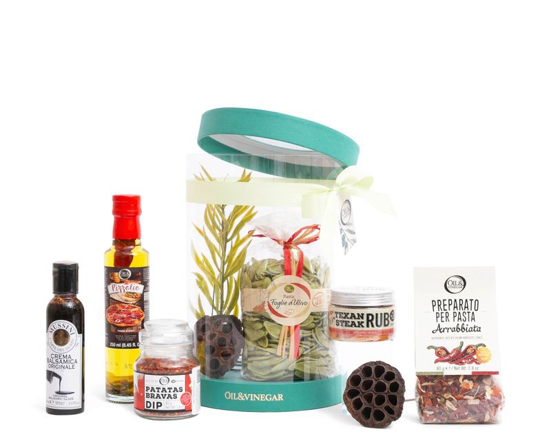Этим подарком можно удивить даже искушенного гурмана! В набор мы поместили ингредиенты для приготовления блюд на ужин — пасту в форме листочков оливы и готовую смесь для дополнения гарнира, известную специю «Пататас Бравас» с солнечным испанским вкусом и смесь трав «Стейк по-техасски» для создания вкуснейшего маринада для мяса, а также густой бальзамический уксус, которым можно украсить салат, и душистое масло для пиццы.