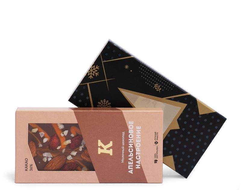 Пожелайте всего самого сладкого и приятного в Новом году с этим волшебным подарком: под праздничной оберткой – пестрая плитка молочного шоколада с миндалем «Апельсиновое настроение».