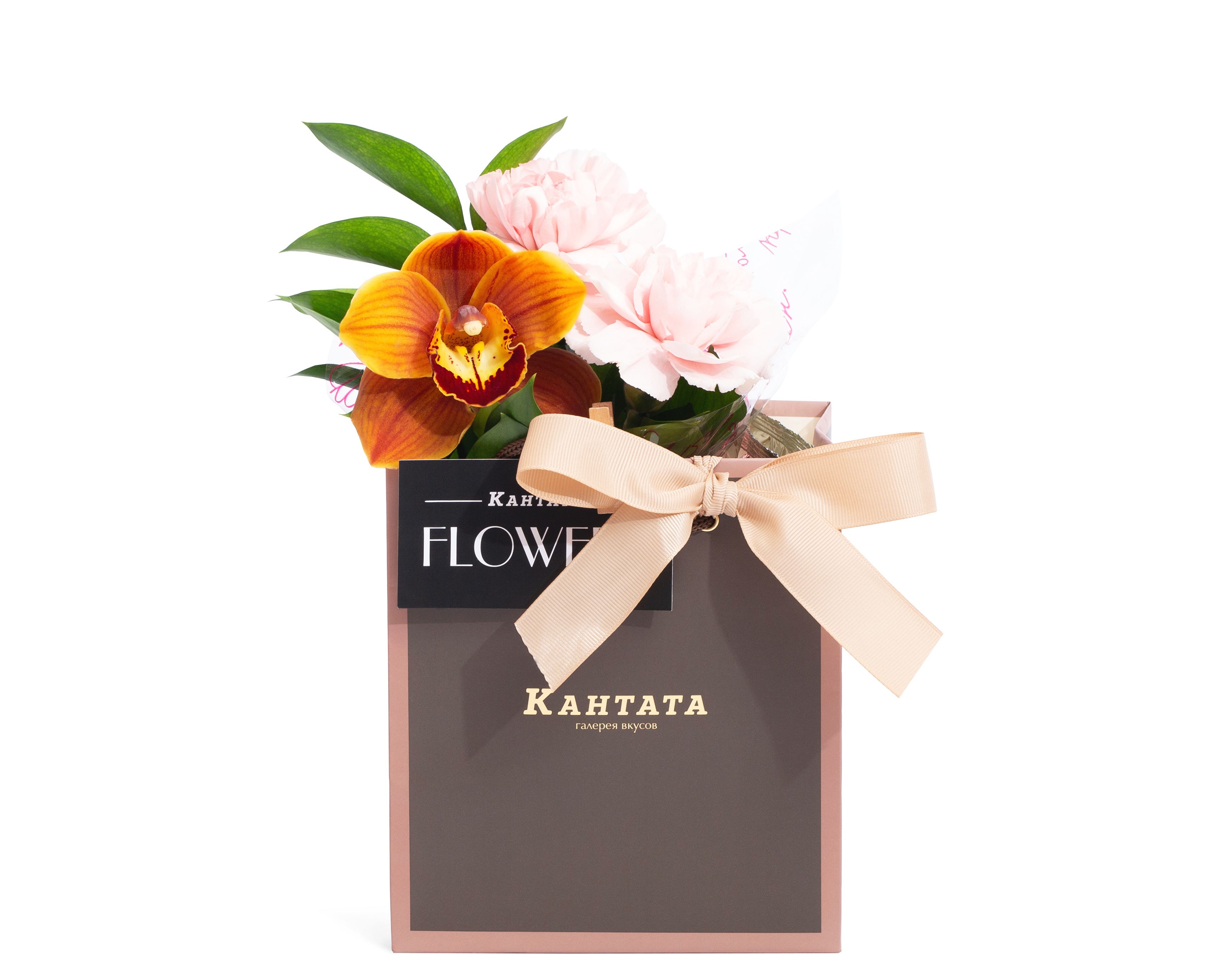 Пестрая орхидея, гвоздика и листочки рускуса украшают подарок, внутри которого — освежающий зеленый чай «Клубника-Киви», классический черный чай Таньян Конгоу с согревающими древесными нотами и плитка молочного шоколада на десерт. Набор дополняет стильная баночка для хранения, которая станет украшением интерьера кухни.