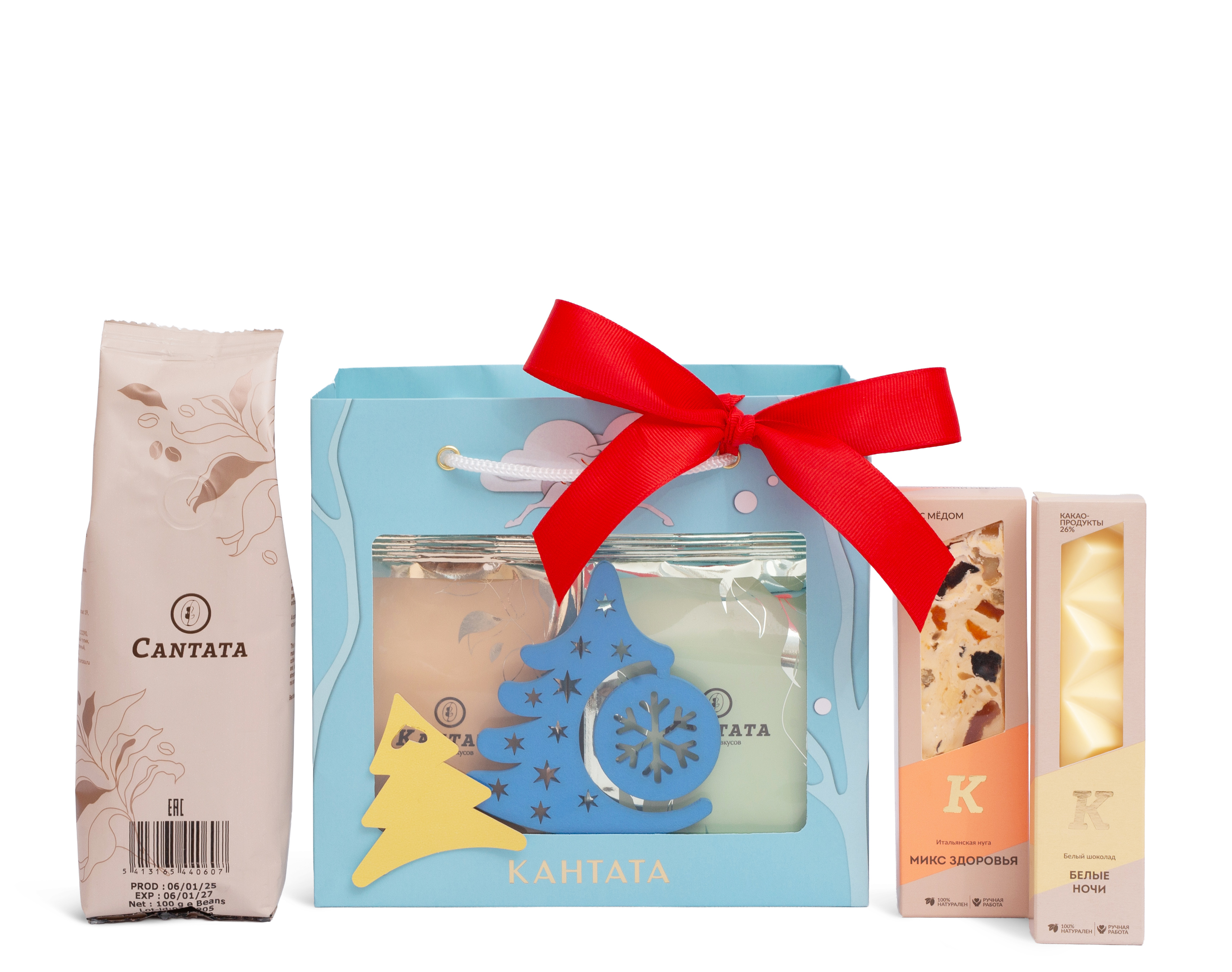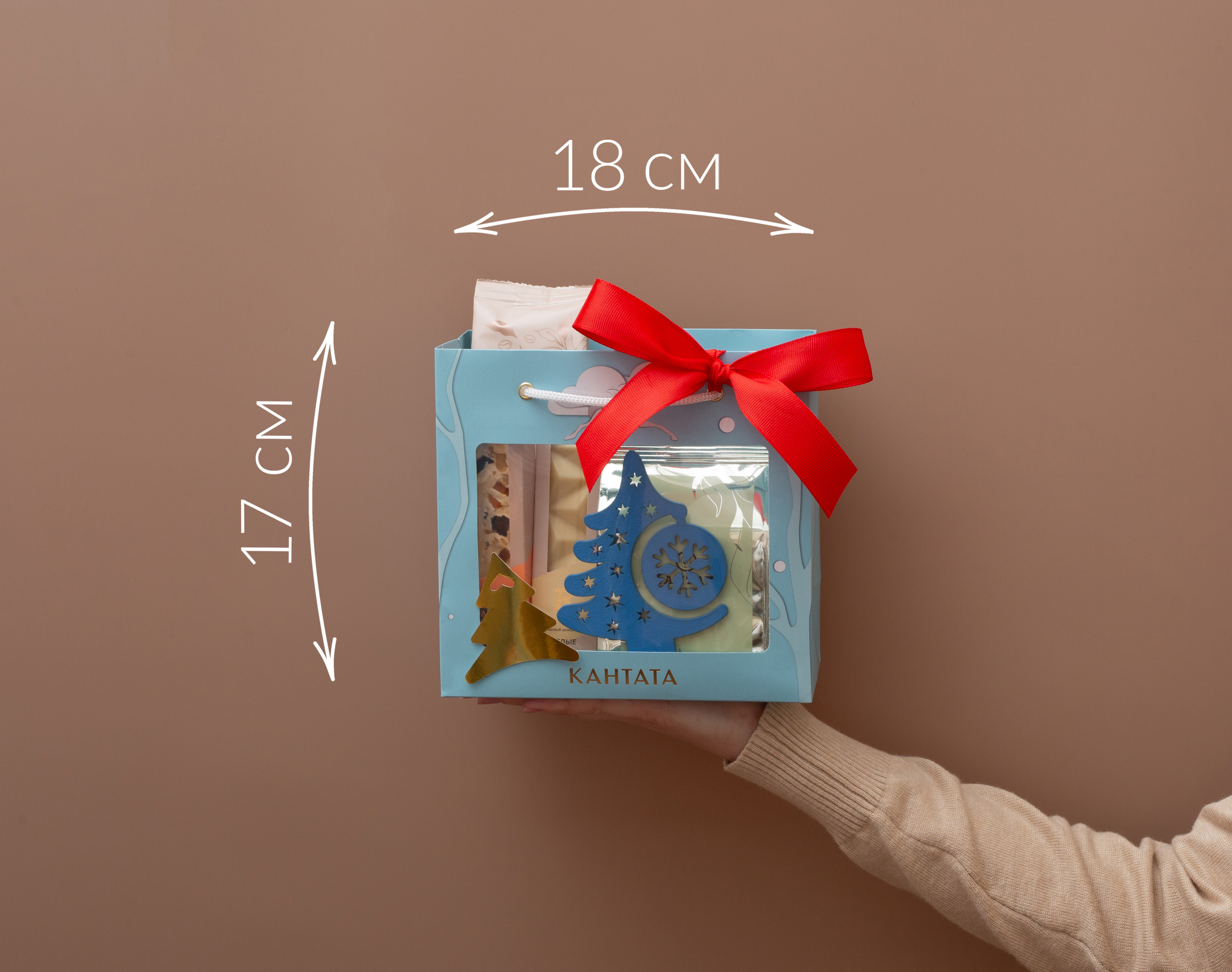 Тёплый и вкусный подарок, который наполнит день уютом. В прозрачной сумке с праздничным декором — отборный чай, кофе, шоколад и нуга. Композицию завершает деревянная ёлочка — символ новогоднего настроения. Универсальный вариант для поздравления коллег, друзей и партнёров.
